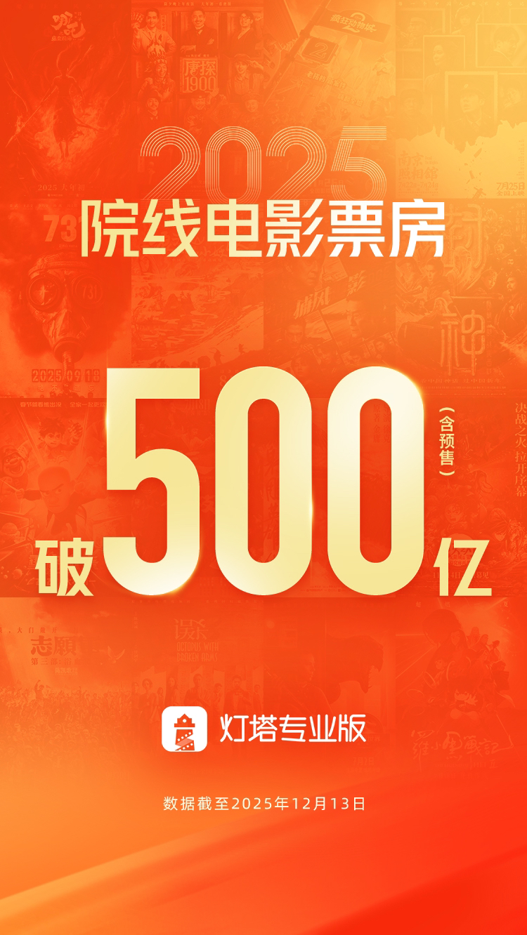 据灯塔专业版数据,截至12月13日,在火爆的贺岁档助推下,2025全年总票房已突破500亿元!这较去年同期提升22%,是继2017、2018、2019和2023年之后,年度票房第五次突破500亿大关。数据显示,2025年全年观影人次接近12亿,放映场次达1.37亿场,平均票价为41.9元,较去年有所下降。