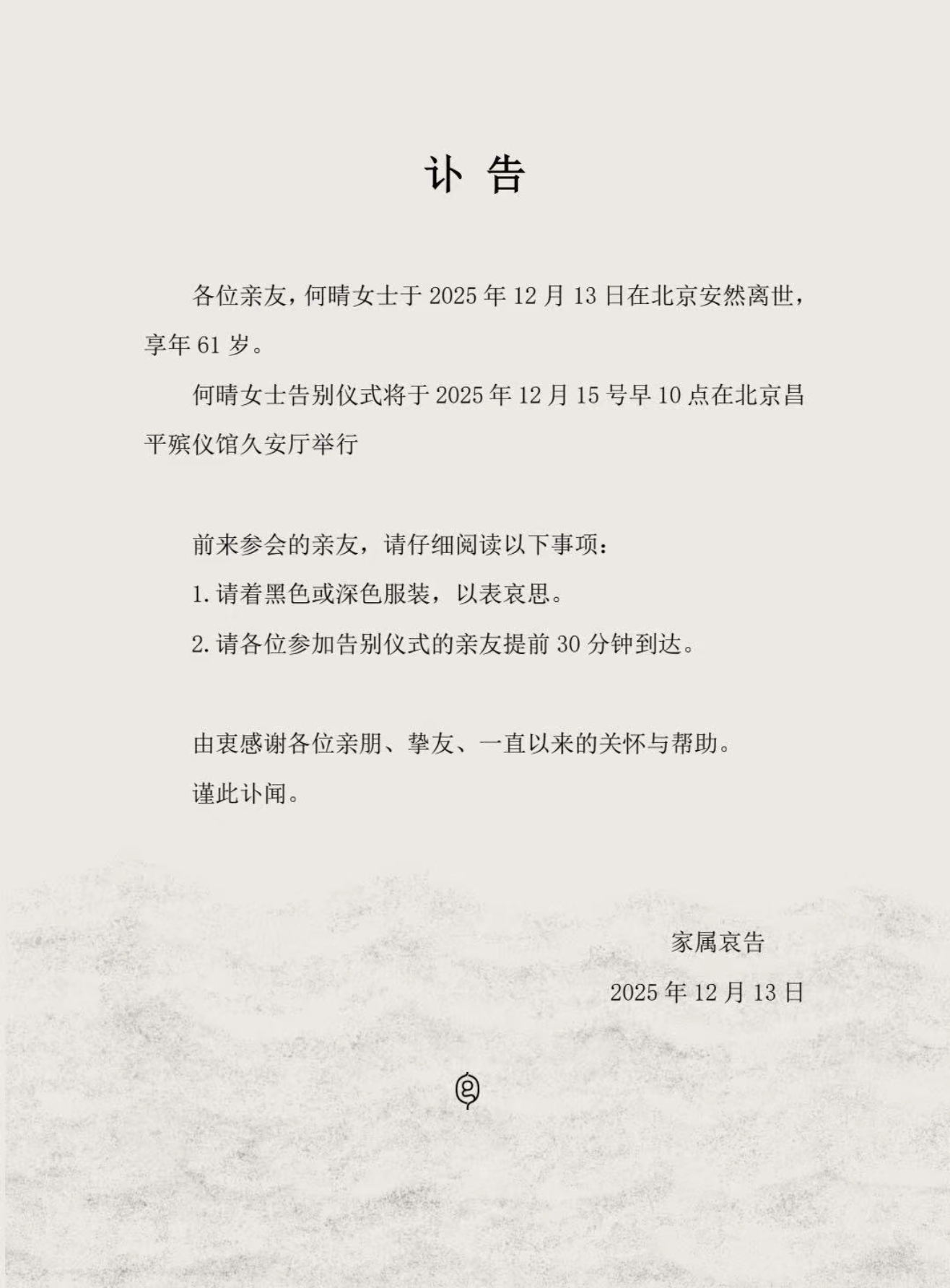12月13日,一份家属发布讣告显示,著名演员何晴在北京安然离世,享年61岁。告别仪式将于2025年12月15日10点在北京昌平殡仪馆久安厅举行。