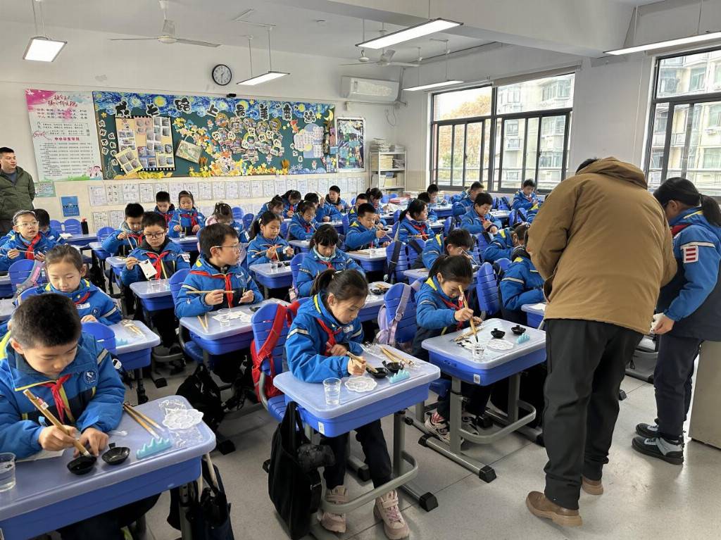 作为曾执教于南京艺术学院、南京大学,且亲手绘制过《道德经》《论语》《山海经》等经典名著画作的美育专家,大吕老师用平实的语言为孩子们讲解:“这些工具看似简单,却是中国画的‘根’—— 古人正是用它们,把山水、花鸟与故事,一笔一画留在了纸上。” 孩子们的目光追随着老师的动作,对 “中国画” 的好奇,在触摸与聆听中悄然萌芽。