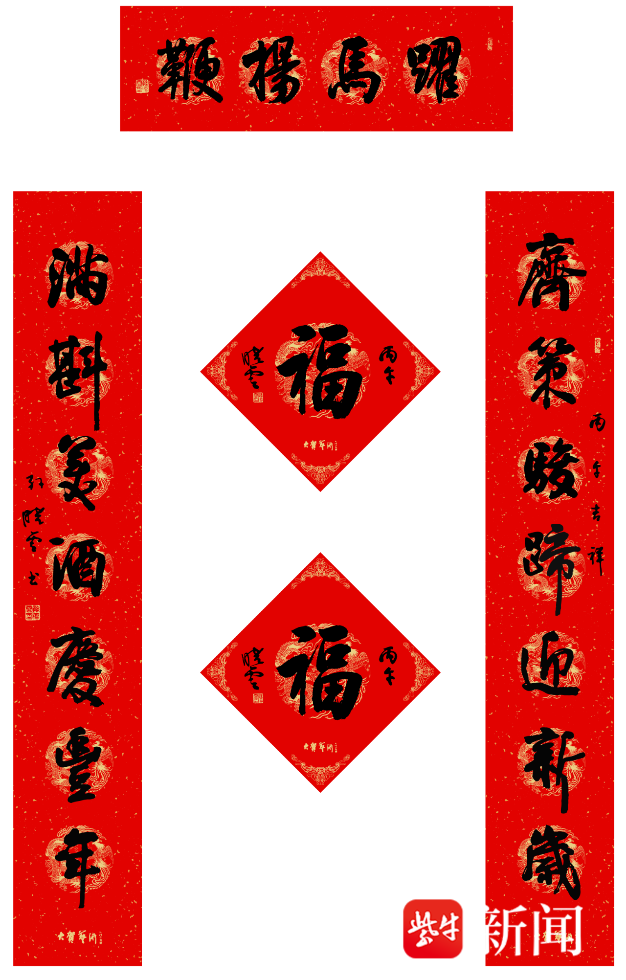 这副楹联上联书“齐策骏蹄迎新岁”,下联书“满斟美酒庆丰年”,横批“跃马扬鞭”。