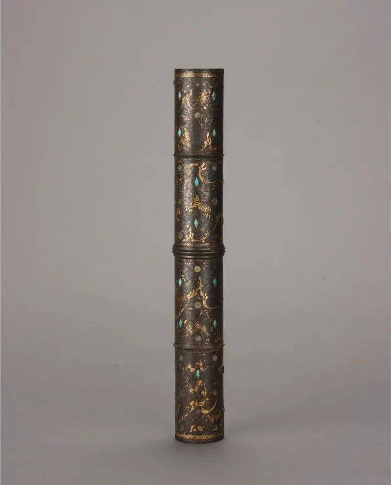 错金银镶松石狩猎纹铜伞挺相当的小巧,长26.5厘米,直径只有2.6厘米,但工艺极为精美,因此被称为“微型金箍棒”。考证认为,这个“小铜管”是用在马车上面的伞铤。所谓“伞铤”,就是古代马车的伞盖顶上那一截伞尖。是在当时的车上支撑伞的一个金属固件。也正是因为是在车上最显眼的位置,故而做得格外精致。“骥骥”飞马造型来自伞挺的第一部分。