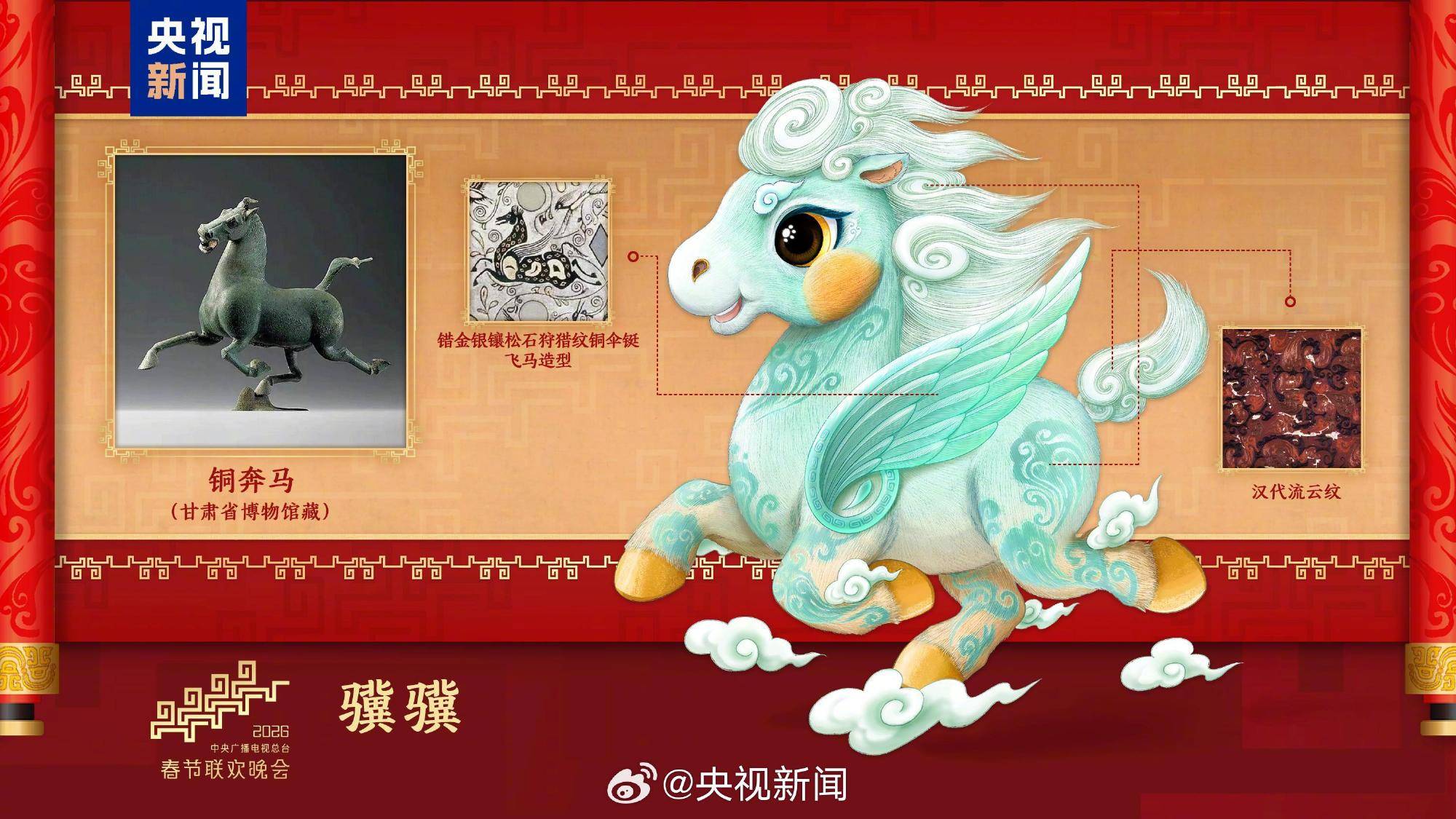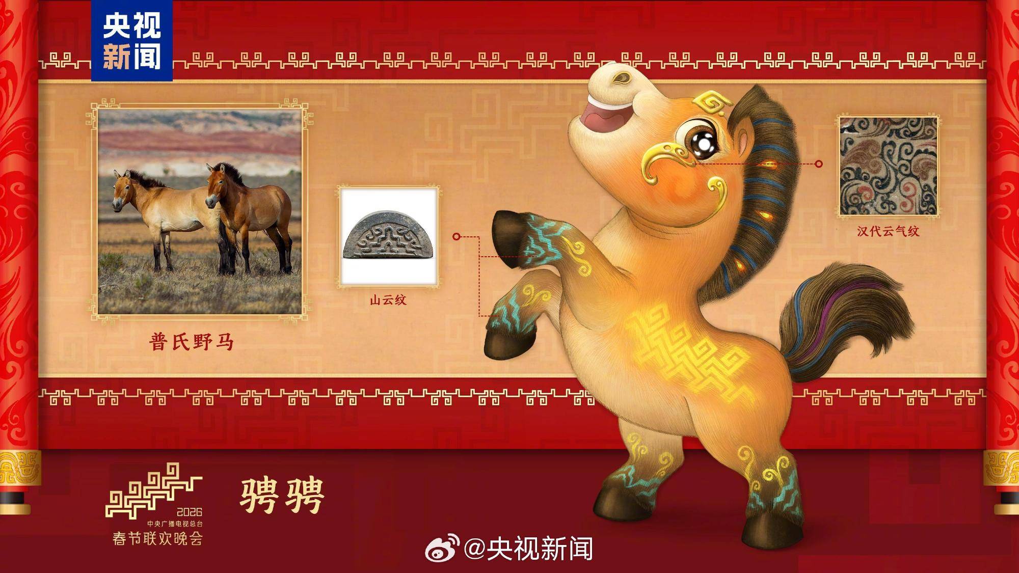 18日上午,中央广播电视总台《2026年春节联欢晚会》发布吉祥物形象。“骐骐”“骥骥”“驰驰”“骋骋”四匹骏马,活泼可爱、意气风发,与晚会主题“骐骥驰骋 势不可挡”一脉相承、相得益彰。吉祥物的设计灵感来源于中国不同时期马的经典形象,并将流云纹、山云纹等千年纹样“穿”上身,充盈着生生不息的历史美感和万象更新的时代气象,饱含马到成功、前程似锦的美好寓意。