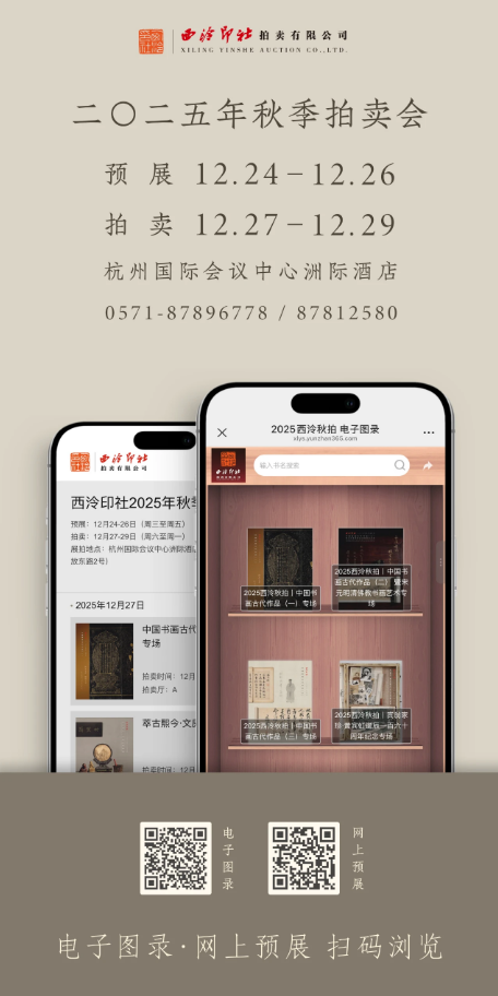 2025西泠秋季拍卖会将于12月24日到12月26日举行预展,并在12月27日到29日在杭州国际会议中心洲际酒店举行拍卖。12月13日到14日已在上海静安昆仑大酒店二楼举行巡展。
