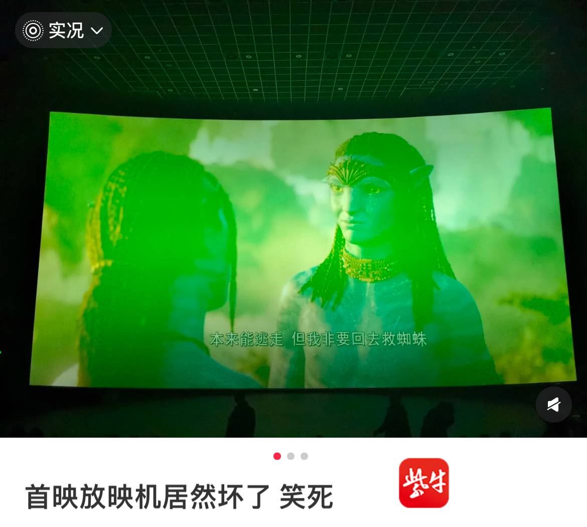 12月19日, 《阿凡达3》正式上映,多地网友在社交平台上配图发文称看《阿凡达3》时遭遇“放映机坏了”。记者看到,实况图上,有的大银幕背景成绿色的了,有的直接放不出,有的是模糊卡顿的。