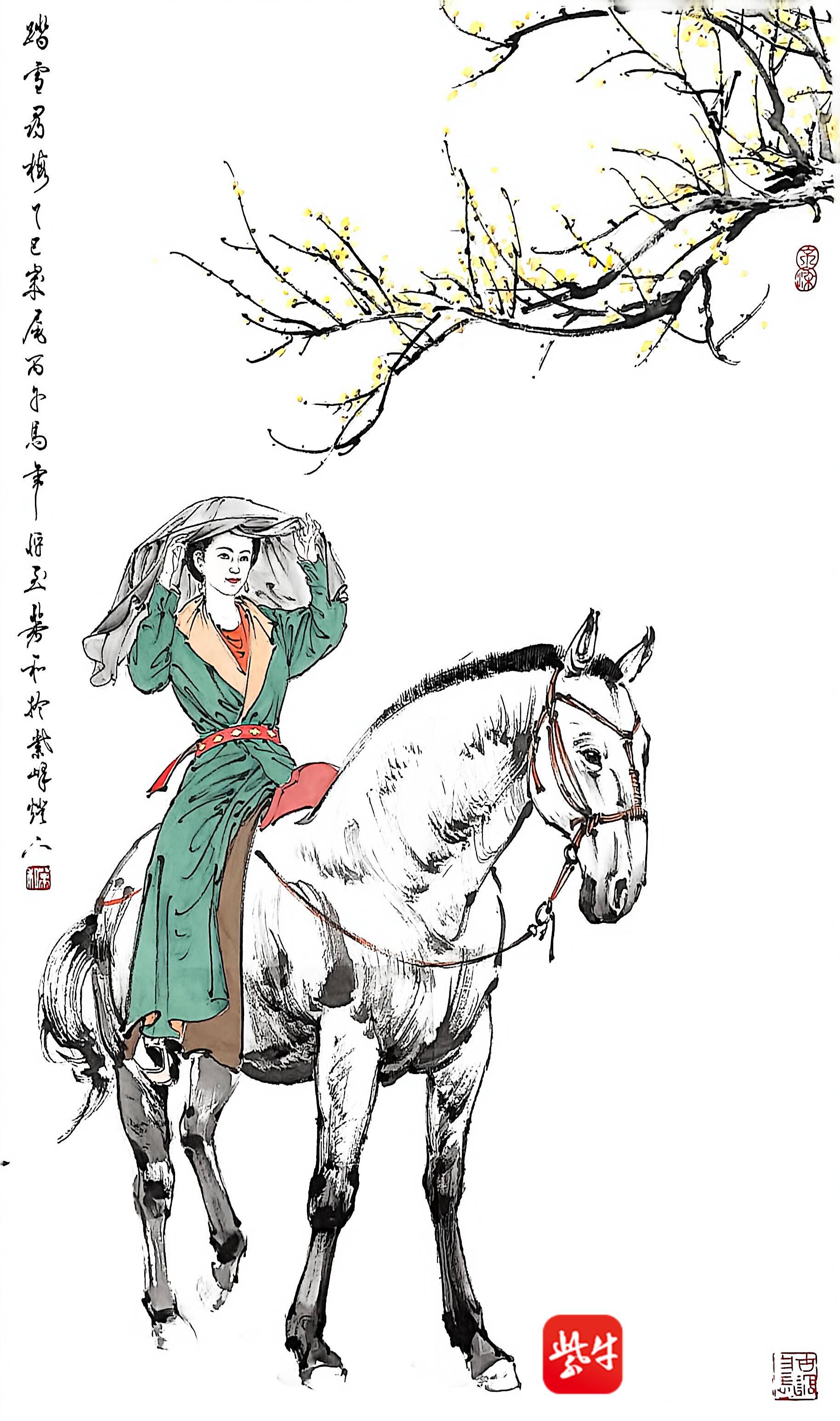“明年是马年,这次活动,‘迎春’也是主题之一,所以我画了这幅《踏雪寻梅》。”画面上,一位唐代仕女骑在马上,画面上空则是一枝腊梅,雪中怒放。“踏雪寻梅,是中国诗词中常见的意象,是文学作品里经常去反映的一个场景。唐代以来,中国人的生活就很讲这种诗情画意。骑马寻梅,实际上也在表达希望新的一年马上成功,也是对即将到来的新的一年的美好祝愿。”萧和说。