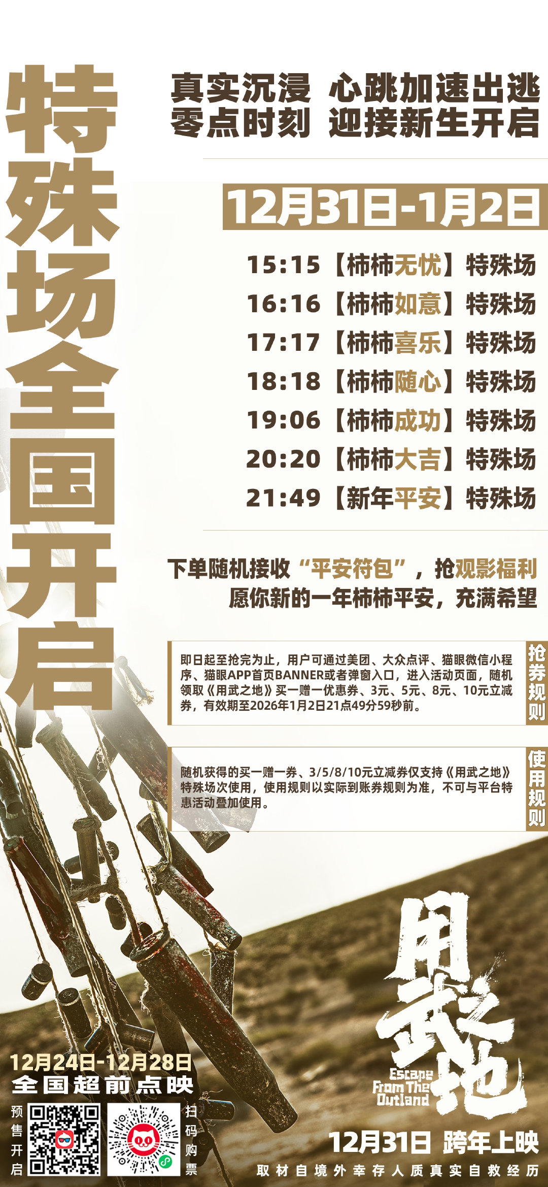 由宁浩监制,申奥执导,申奥、许渌洋编剧,肖央、齐溪、任达华、郑恺领衔主演,潘斌龙特别出演的电影《用武之地》正在进行预售。今日,电影官宣二轮点映开启,将于2025年12月24日-26日18:00-22:00、12月27日-28日14:00-22:00进行全国点映抢先看。