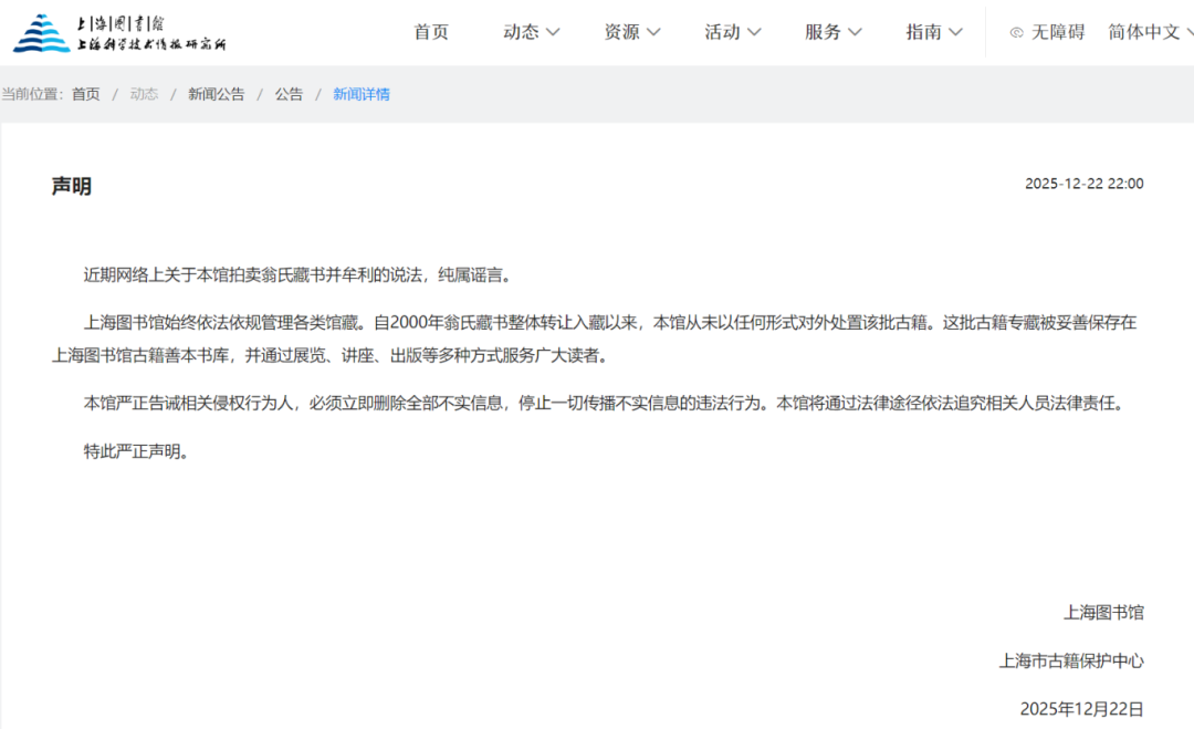 12月22日晚,上海图书馆严正声明,澄清近期网络传上海图书馆拍卖翁氏藏书并牟利一事纯属谣言。“上海图书馆始终依法依规管理各类馆藏。自2000年翁氏藏书整体转让入藏以来,本馆从未以任何形式对外处置该批古籍。这批古籍专藏被妥善保存在上海图书馆古籍善本书库,并通过展览、讲座、出版等多种方式服务广大读者。本馆严正告诫相关侵权行为人,必须立即删除全部不实信息,停止一切传播不实信息的违法行为。本馆将通过法律途径依法追究相关人员法律责任。”