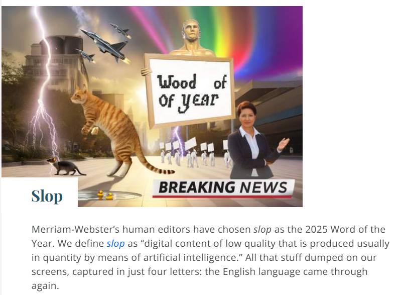12月底,美国权威词典品牌《韦氏词典》公布了2025年的年度词汇slop。这个词语被翻译为“AI泔水”,《韦氏词典》对这个词的定义是“通常由人工智能(AI)批量生成的低质量数字内容”。