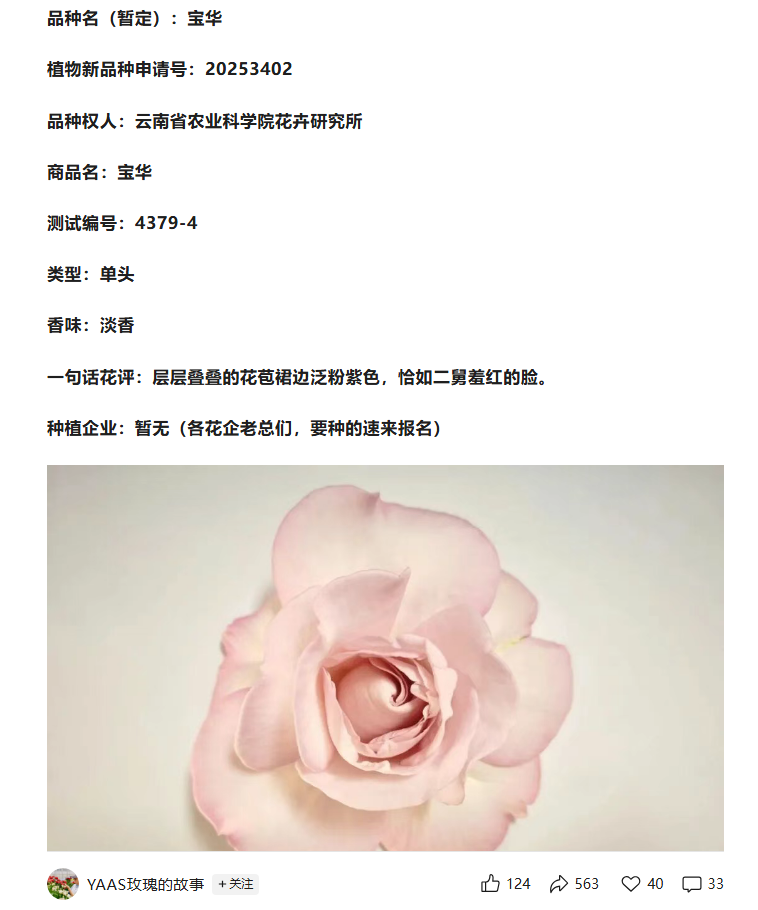 不久前,云南省农科院开启了为新品种月季4379-4征名的活动,云南省植物学会科学传播工作委员会委员、科普博主植物眼发帖全网征集新品种月季的名字。一开始网友们给出的名字还挺诗情画意,有的说这种月季的花瓣像《甄嬛传》里甄嬛跳惊鸿舞时水袖的配色,可以叫惊鸿,还有人觉得花瓣的配色像童年时的奶油花,不如叫旧梦,直到有位山东网友发出评论“刘宝华月季,因为我二舅叫刘宝华。”这条看起来像是开玩笑的回复获得了13.8万的赞,云南省农科院倒也没含糊,真的就按“宝华”这个名字上了国家林草局官网进行申报,这款宝华月季还没推广进入花市就已成月季花圈的新晋顶流。