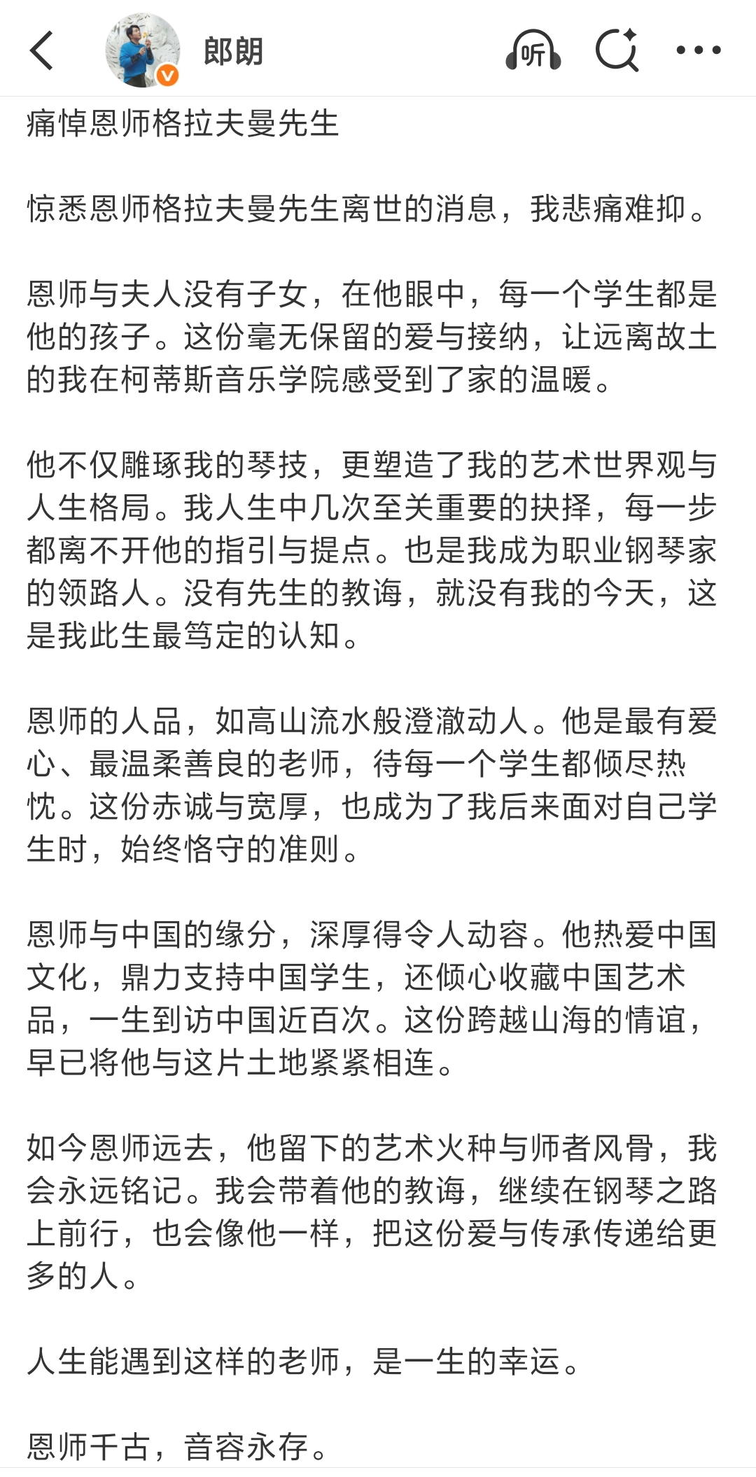 钢琴教育家格拉夫曼去世,郎朗发长文悼念恩师