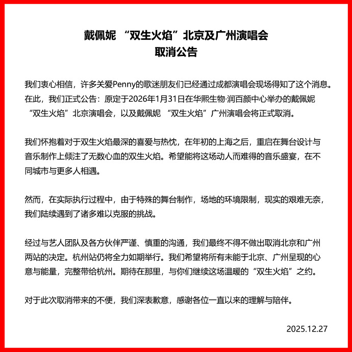 12月27日晚,歌手戴佩妮在“双生火焰”成都站演唱会现场宣布,将取消还没有开票的北京站和广州站演出,已开票的1月17日杭州站将成为“双生火焰”内地巡演的最后一站。戴佩妮告诉歌迷们:“很可惜,但是没有遗憾。”她表示“一直都不避讳这样的场面,我如果自己做不好,我就承认自己做不好,我不会强撑着说怎么样,然后要大家帮我一直吹得很厉害。” 她哽咽表示因为票房不理想,难以负担舞台成本,不得已取消明年1月的北京站,以及3月的广州站演唱会,及时止损。