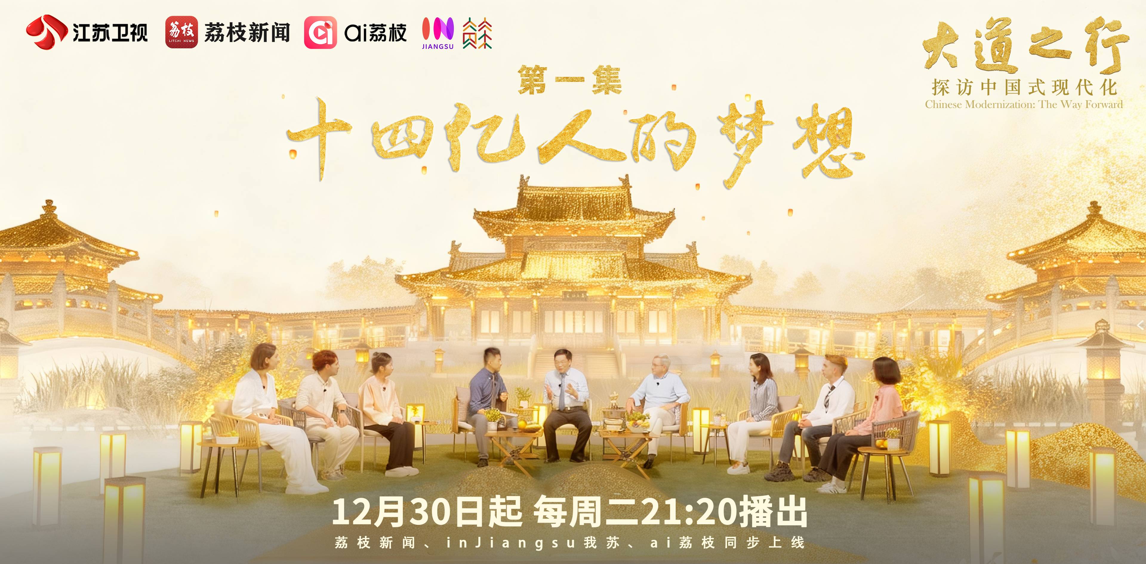 为深入学习贯彻习近平新时代中国特色社会主义思想,展现中国式现代化的鲜明特色和深刻内涵,由江苏省委宣传部指导,江苏广电总台出品的5集大型通俗理论节目《大道之行:探访中国式现代化》于 12月30日21:20在江苏卫视开播,并同步上线荔枝新闻、inJiangsu我苏、ai荔枝等平台,每周推出一集,持续呈现。