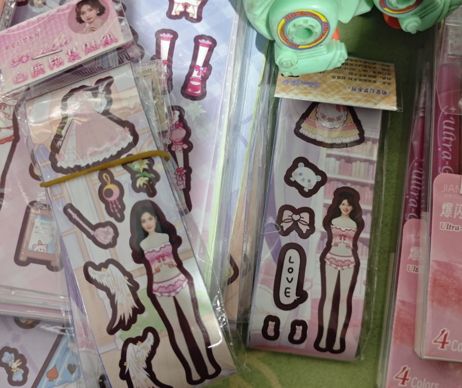 “在店里看到的,感觉好不尊重明星啊。”最近,一名网友在社交平台发帖,称自己在某个店中发现了一款“明星换装贴纸”,这款贴纸将明星的头像照片和不同的身体、服装图案拆分拼接,消费者可以自行搭配为“明星换装”,组装不同的造型。被制成换装贴纸的明星头像包括白鹿、鞠婧祎等知名艺人。