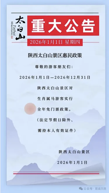 陕西宝鸡的太白山景区、红河谷景区,2026年1月1日至12月31日对生肖属马游客实行全年免门票政策(法定节假日除外),游客凭本人有效身份证件即可入园 。
