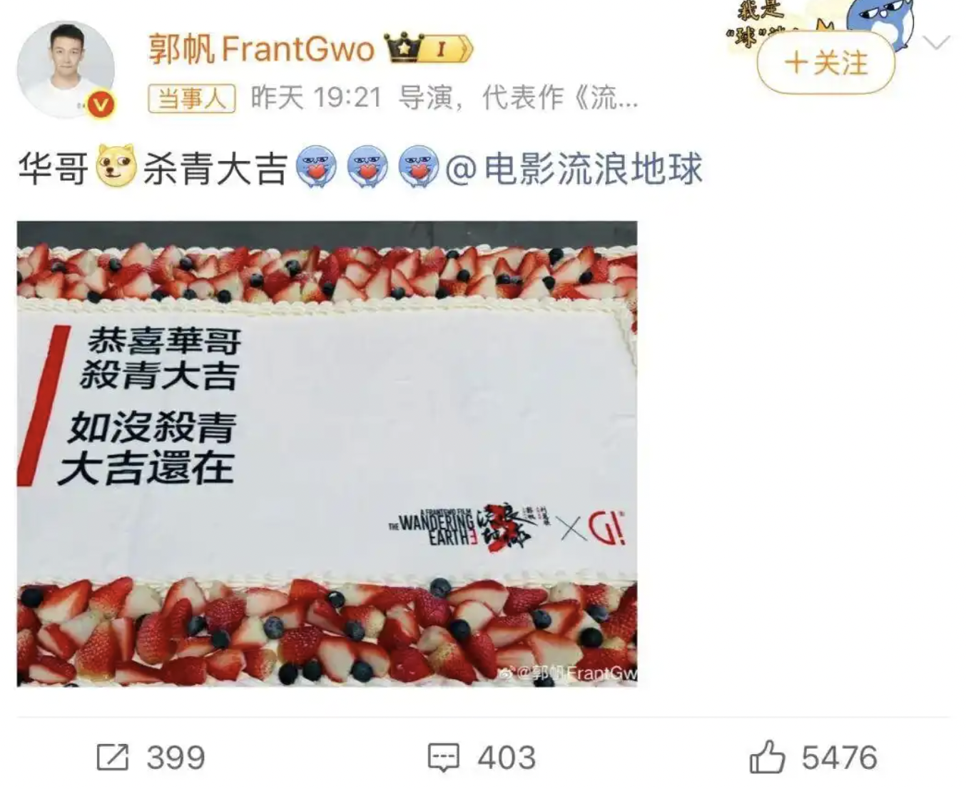 1月9日晚,郭帆导演在社交平台上晒蛋糕,祝贺刘德华在《流浪地球3》的戏份杀青,杀青蛋糕上的配文是:“恭喜华哥,杀青大吉,如没杀青,大吉还在。”