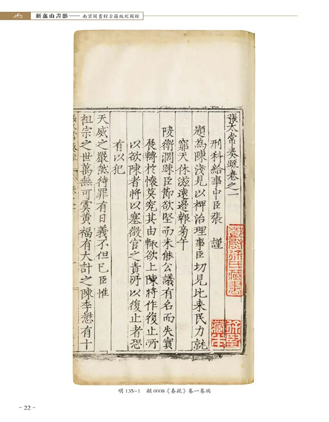 宋刻本板块,此次图录除对三朝邋遢本有所选择外,尽量做到应收尽收,并于未编书中发现残卷、残叶增补版刻品种。金元刻本板块,除馆藏名品外,择取有代表性的官刻、坊刻以及含赵字特征的古籍。明刻本板块,以明初似元,中期仿宋,后期套印、手写、瘦长方体字等不同版刻特征作为大的时代发展脉络,兼顾官刻、藩刻、坊刻、家刻等版刻主体性质,以及北京、苏州、建安等版刻中心地和辐射周边地,择取具有时代、地域特征的古籍。清刻本板块,以时代为序,前期兼顾软体字、方字,中期注重精校精印、名家仿宋、名手写刻,后期多择取字体、版式等方面较有特色或资料性较强的版本,女性著作、江苏地方文献、金陵本地刊本等亦有收取。活字印本板块,兼顾泥、铜、木、锡、铅等不同材质、不同机构、不同时期、不同地区的活字印本,以及迭经收藏的名品。版画板块,选取建安派、金陵派、苏州派等不同风格的版画作品,包括名手佳刻、流派代表,以明末居多,清代版画佳品不多,选取时从题材、手法等特色方面考虑。