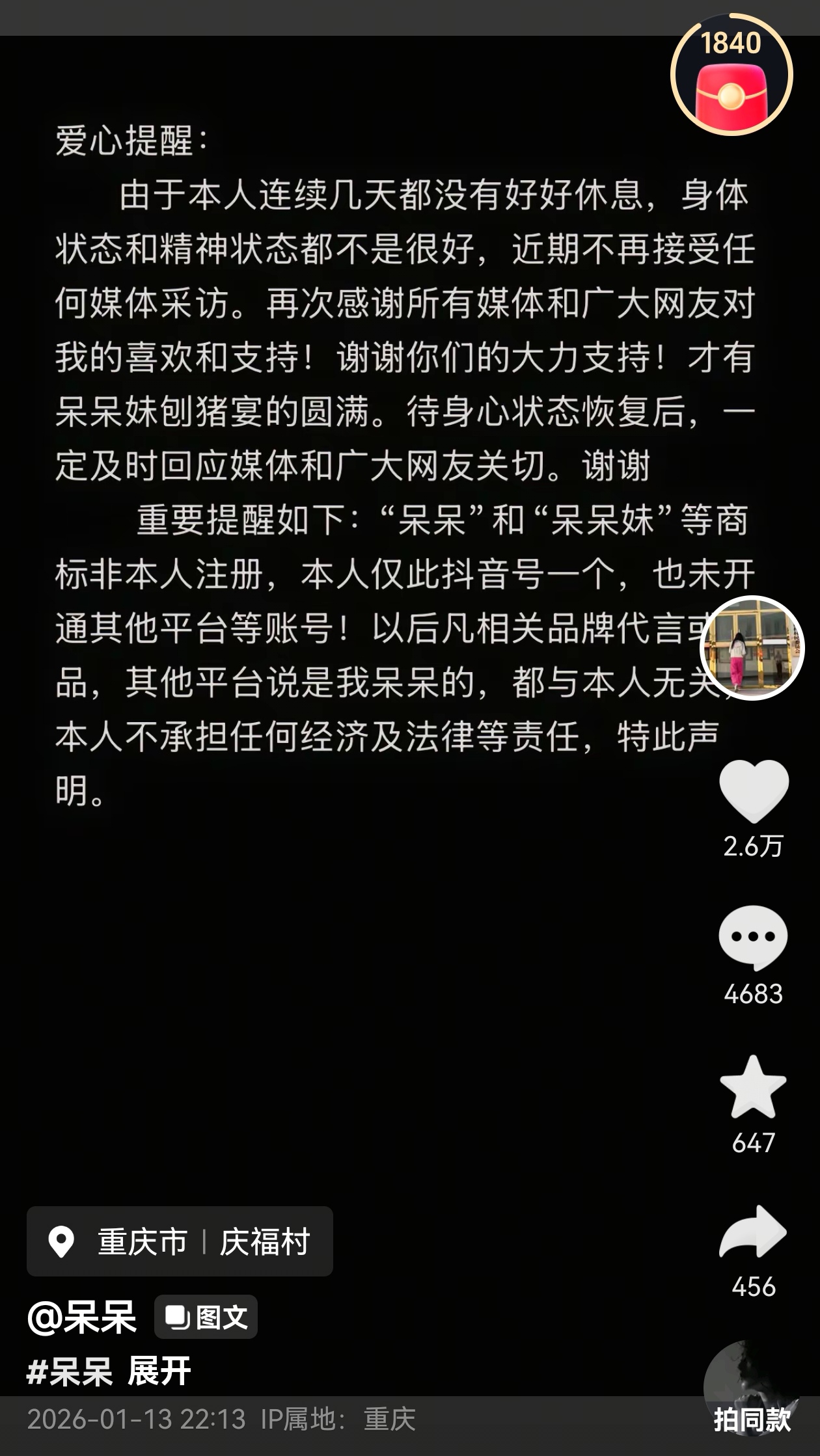 1月13日,因“杀年猪带动合川走红”引发关注的网红“呆呆”通过其抖音账号发布声明,称因连续多日未休息好,身体与精神状态欠佳,近期将不再接受任何媒体采访,同时就商标权属、账号运营及品牌合作等问题作出澄清。