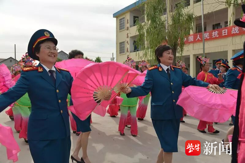 2015年6月合唱团在军屯村演出,陈赓大将的女儿陈知进、旷伏兆将军的女儿旷平淀与村民们扭秧歌联欢