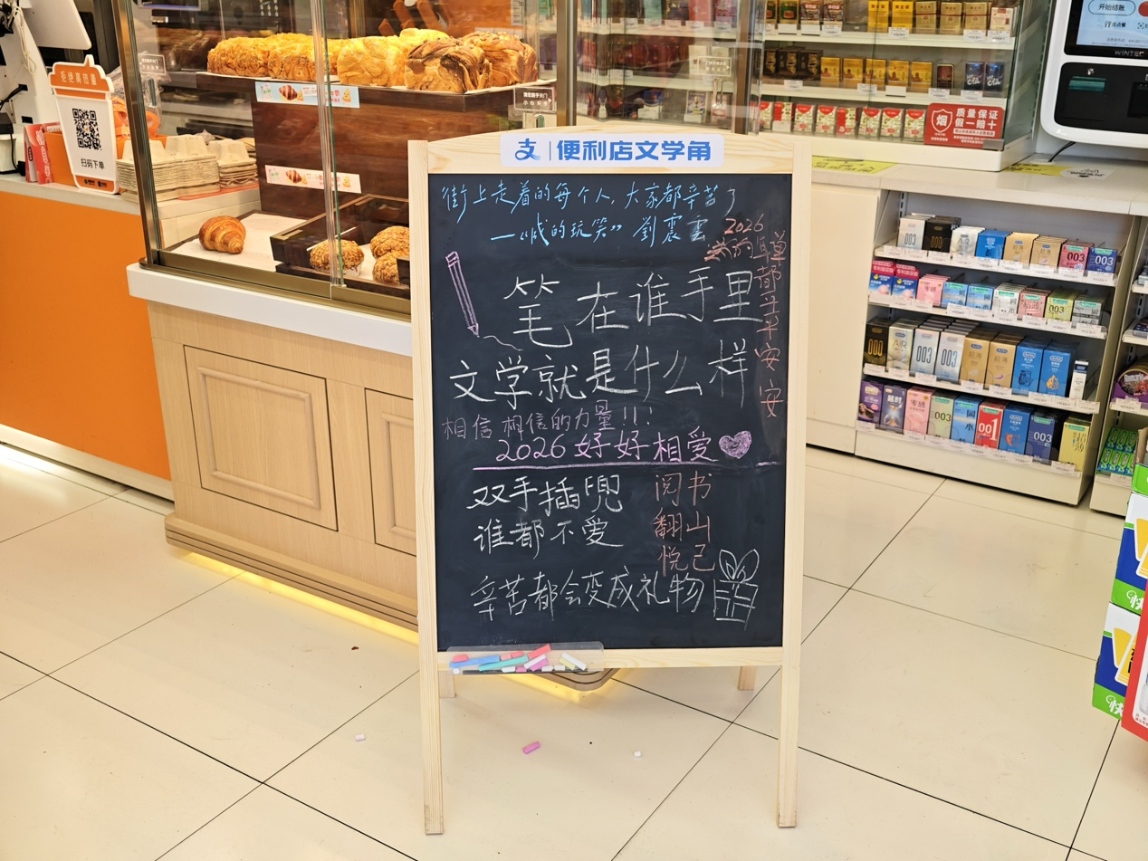去年12月底,国家语言资源监测与研究中心发布“2025年度十大新词语”,“新大众文艺”一词入选,这也说明了“新大众文艺”已经从一个民间现象上升为文化领域中不可忽视的重要力量,新大众文艺的践行者就在我们身边,触动人心的文学可能诞生在世界上任何一个角落,可以在送快递、送外卖的路上,也可以是在菜市场、在农田,还可以是一篇网络帖文,一段留言评论,当然也能是便利店的小黑板。