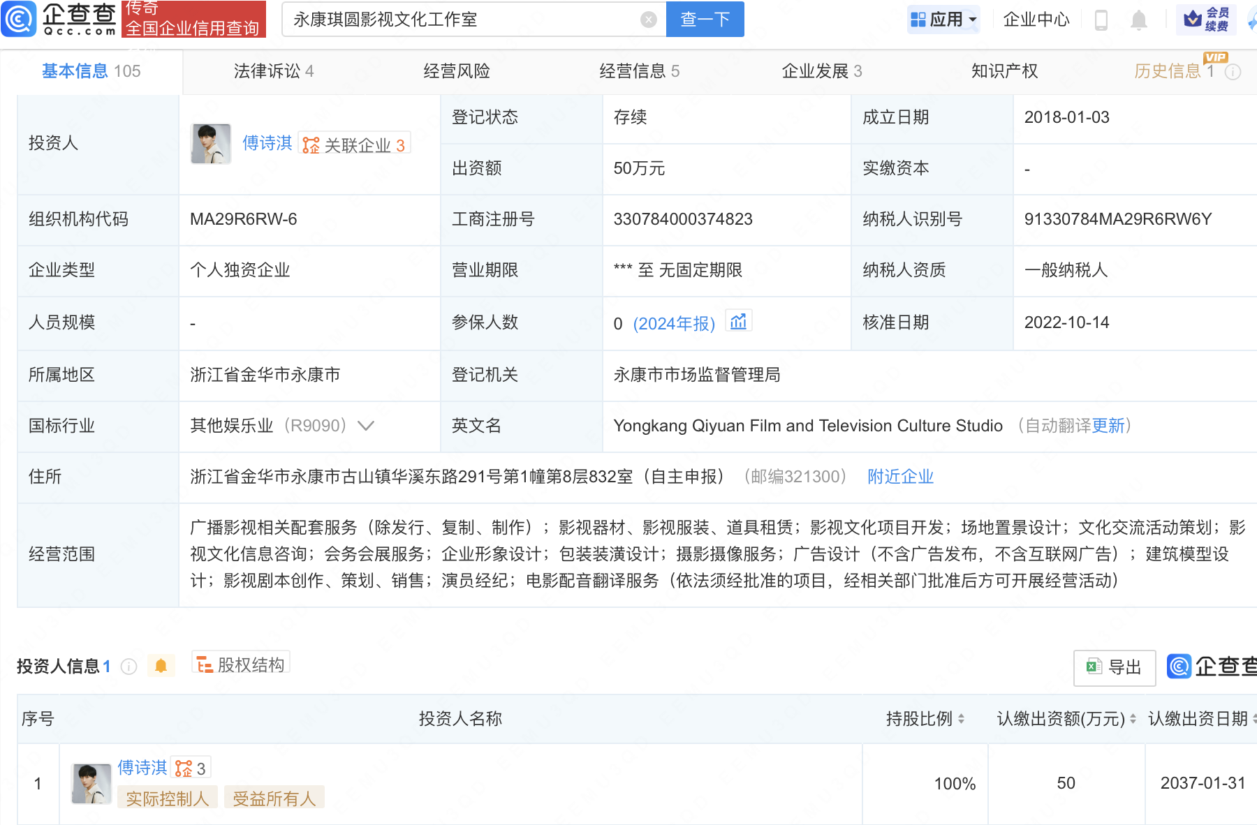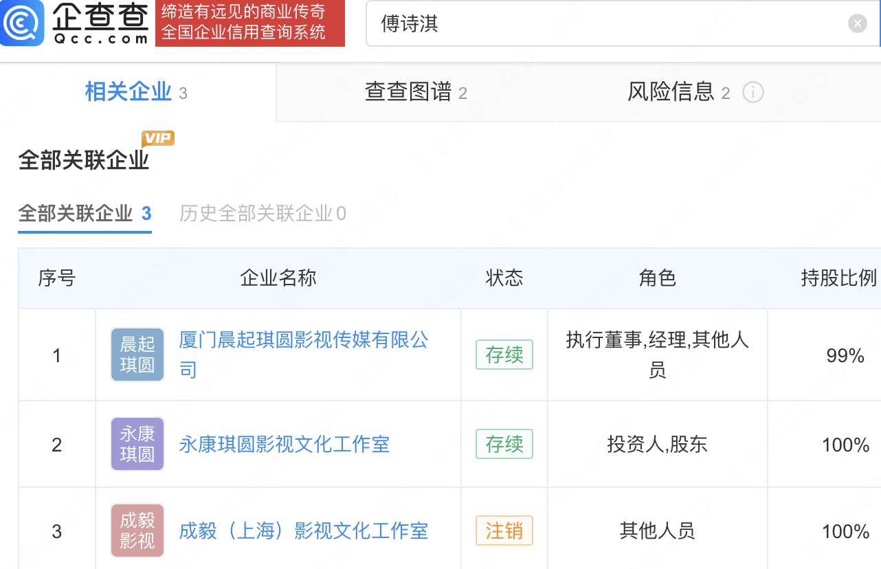企查查APP显示,傅诗淇(成毅)名下关联3家企业,其中永康琪圆影视文化工作室为其个人独资工作室。该工作室成立于2018年1月,出资额50万人民币,经营范围包括广播影视相关配套服务、影视文化项目开发等。