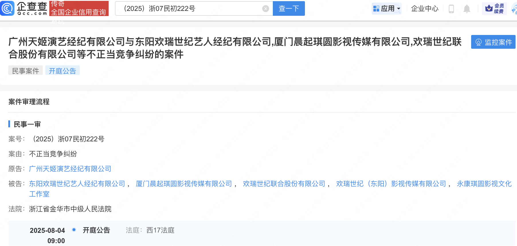 此外,傅诗淇(成毅)名下厦门晨起琪圆影视传媒有限公司、永康琪圆影视文化工作室及欢瑞世纪联合股份有限公司、东阳欢瑞世纪艺人经纪有限公司、欢瑞世纪(东阳)影视传媒有限公司曾因不正当竞争纠纷,被广州天姬演艺经纪有限公司起诉。据悉,广州天姬演艺经纪有限公司为成毅前经纪公司。