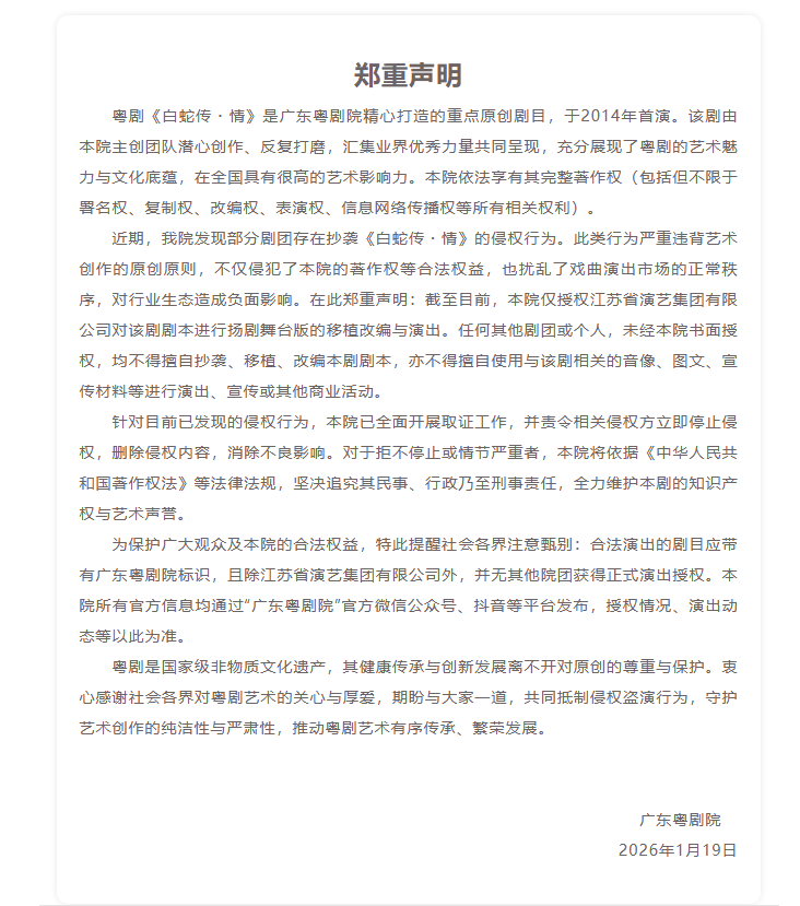 广东粤剧院表示,粤剧院近期发现部分剧团存在抄袭《白蛇传・情》的侵权行为,针对目前已发现的侵权行为,本院已全面开展取证工作,并责令相关侵权方立即停止侵权,删除侵权内容,消除不良影响。同时,广东粤剧院也声明了仅授权江苏省演艺集团有限公司对该剧剧本进行扬剧舞台版的移植改编与演出,任何其他剧团或个人未经粤剧院书面授权,均不得擅自抄袭、移植、改编本剧剧本,亦不得擅自使用与该剧相关的音像、图文、宣传材料等进行演出、宣传或其他商业活动。