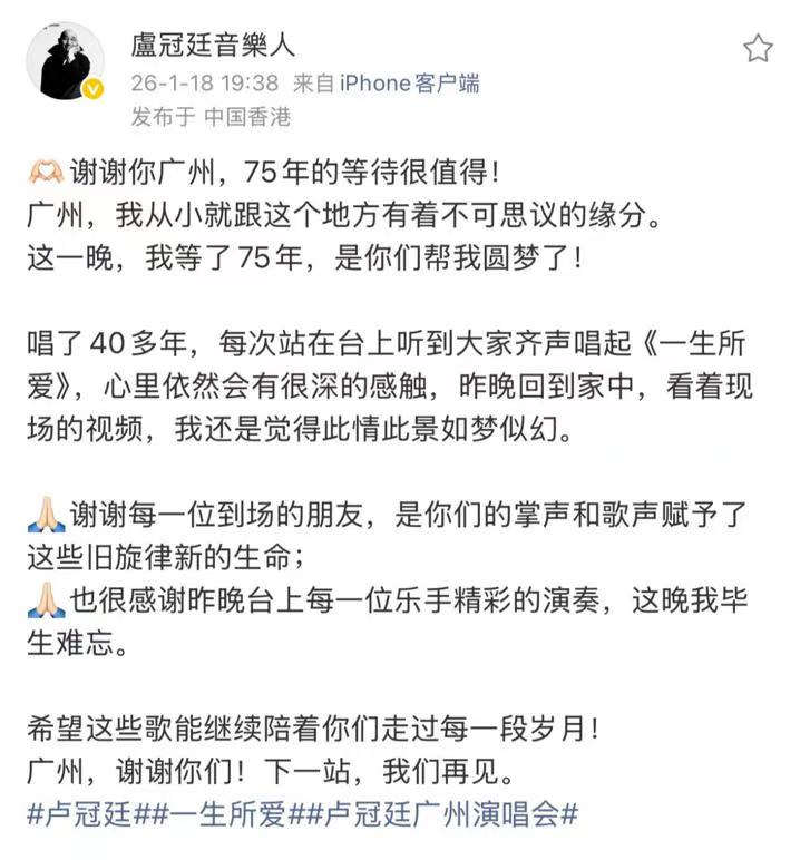 1月17日晚,广州天河体育中心体育馆内温情流淌。香港乐坛传奇音乐人卢冠廷携“My Music·My Life 一生所爱”演唱会开唱。这不仅是卢冠廷入行43年来的首场内地大型个人演唱会,更是一部凝练人生故事的“有声音乐自传”,让全场观众在经典旋律中,完成了一次跨越代际的情感共振。