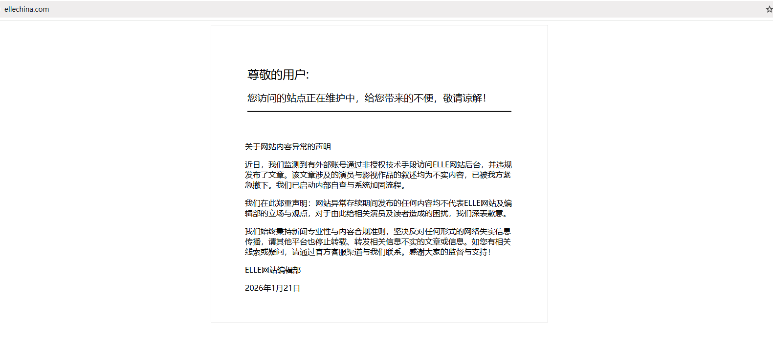 1月21日,一条发布在ELLE中文网官网上的文章引发争议,该文章批评某男演员主演的剧集存在“数据泡沫”与创作缺陷。21日下午,ELLE中文网紧急关闭,网站编辑部发文回应此事,称监测到有外部账号通过非授权技术手段访问ELLE网站后台,并违规发布了文章。该文章涉及的演员与影视作品的叙述均为不实内容,现文章已紧急撤下,并启动内部自查与系统加固流程,ELLE对给相关演员和读者造成的困扰致歉。有网友表示希望ELLE中文网对此事进行彻查,找出该事件发生的原因和文章来源。