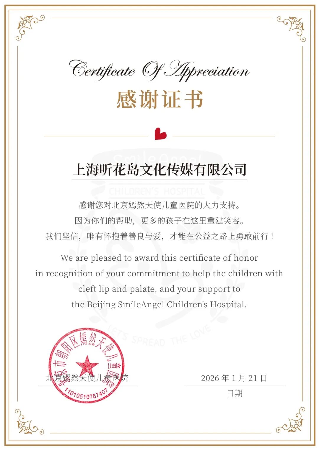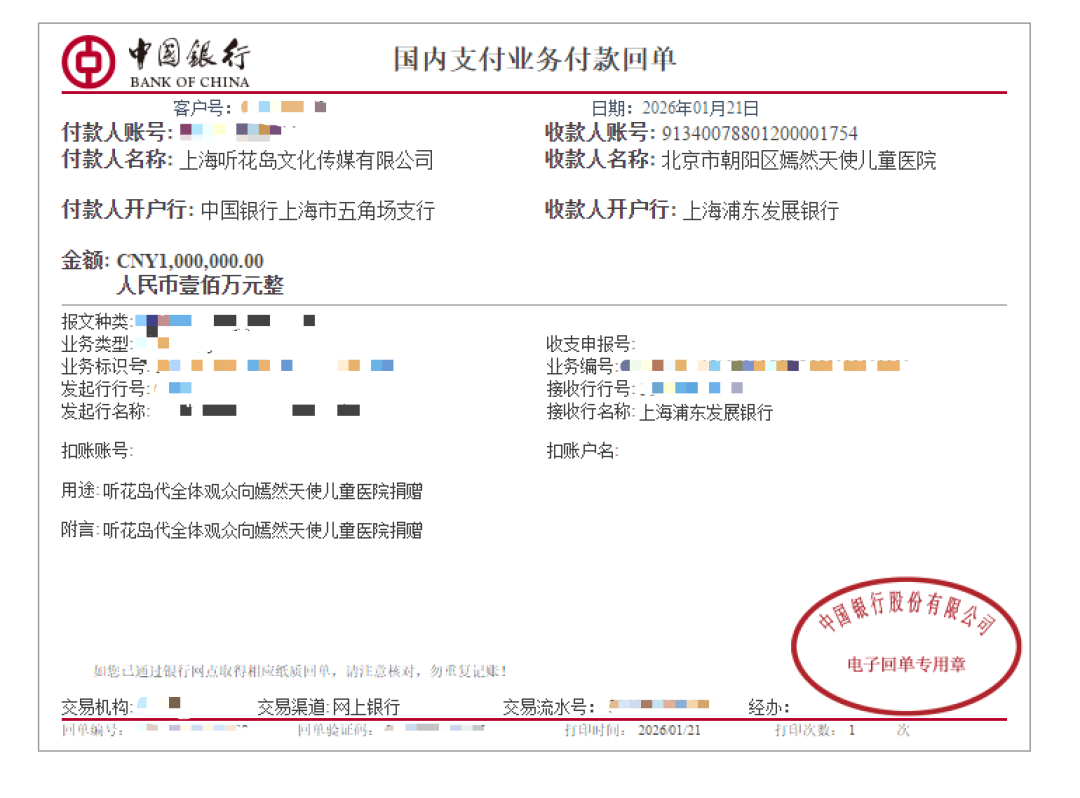 1月21日,短剧制作团队上海听花岛文化传媒有限公司代表全体爱心观众,向北京市朝阳区嫣然天使儿童医院捐赠100万元善款,专项用于医院日常运营及贫困地区唇腭裂儿童的医疗手术支持。