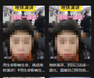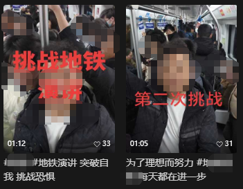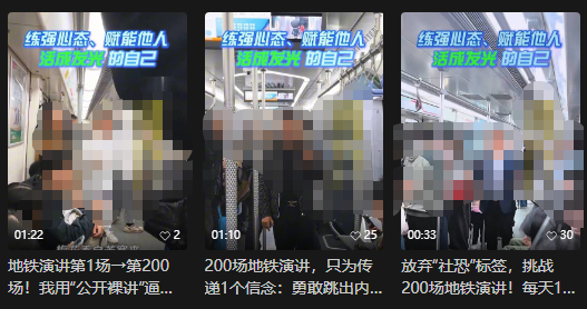记者注意到,冠以“正能量”“挑战自我”“克服自卑”为名号在地铁拍摄高声演讲视频的博主不在少数,其中有部分博主开启了“在地铁完成xx场演讲”的挑战,视频的模式大同小异,博主对着镜头高声演讲“成为想要成为的自己”“只要有勇气就能战胜所有困难”“传播正能量,我们在路上”之类的话,这些视频都没有对地铁上的乘客面部做打码处理,有的视频中还能看到有乘客一脸迷惑地看向了镜头,也有人举起了手机拍摄博主。在评论区中,有人佩服这些博主很有勇气,有人批评在地铁上演讲拍视频太扰民,还有人怀疑这是一种正在被竞相模仿的“起号”赛道。
