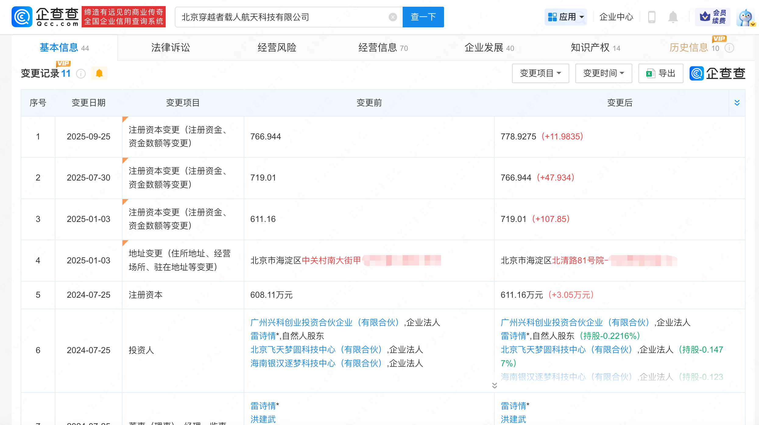 据企查查信息显示,“穿越者壹号(CYZ1)”关联北京穿越者载人航天科技有限公司成立于2023年1月,法定代表人为雷诗情,注册资本778.9万人民币,由雷诗情、谢萌、海南银汉逐梦科技中心(有限合伙)等共同持股。变更记录显示,2025年该公司曾多次增资。