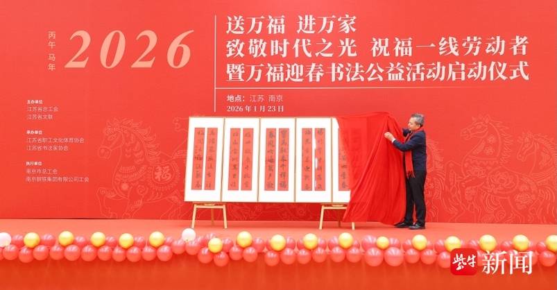 笔墨迎春,福送万家。1月23日,2026年“送万福 进万家”“致敬时代之光·祝福一线劳动者”书法公益活动在南京钢铁集团拉开帷幕。本次活动由省总工会、省文联联合主办,是深入贯彻落实习近平文化思想,大力弘扬中华优秀传统文化,丰富职工精神文化生活,将文化惠民与工会“送温暖”工作深度融合的具体行动。省人大常委会副主任、省总工会主席魏国强,省政协副主席、省文联主席姚晓东等出席活动。