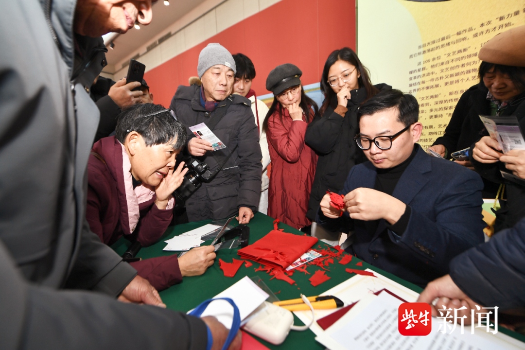 展览现场还设有多项沉浸式互动,中国民间文艺“山花奖”获得者、徐州剪纸第三代传承人刘冠玉为观众现场展示剪纸技艺并赠送剪纸小礼品,非遗金陵插花传承人茅益榛现场开展插花教学,新文艺群体书法家现场 “福”字,活动现场喜气洋洋。