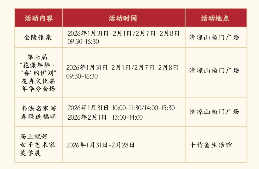 清凉山金陵雅集连开两周不打烊,本周末和下周(2月7 日 - 2 月 8 日)精彩持续!邀上家人挚友,踏千年古径,赏六朝遗韵,观新春花艺,在非遗手作的匠心里触摸传统温度,于笔墨书香的雅致中汲取新春福气,在繁花暗香间邂逅春日生机。定格马年新春最具韵味的美好瞬间,共赴一场文化、福气与花香的双向奔赴,让新年的美好,从清凉山欣然启程。