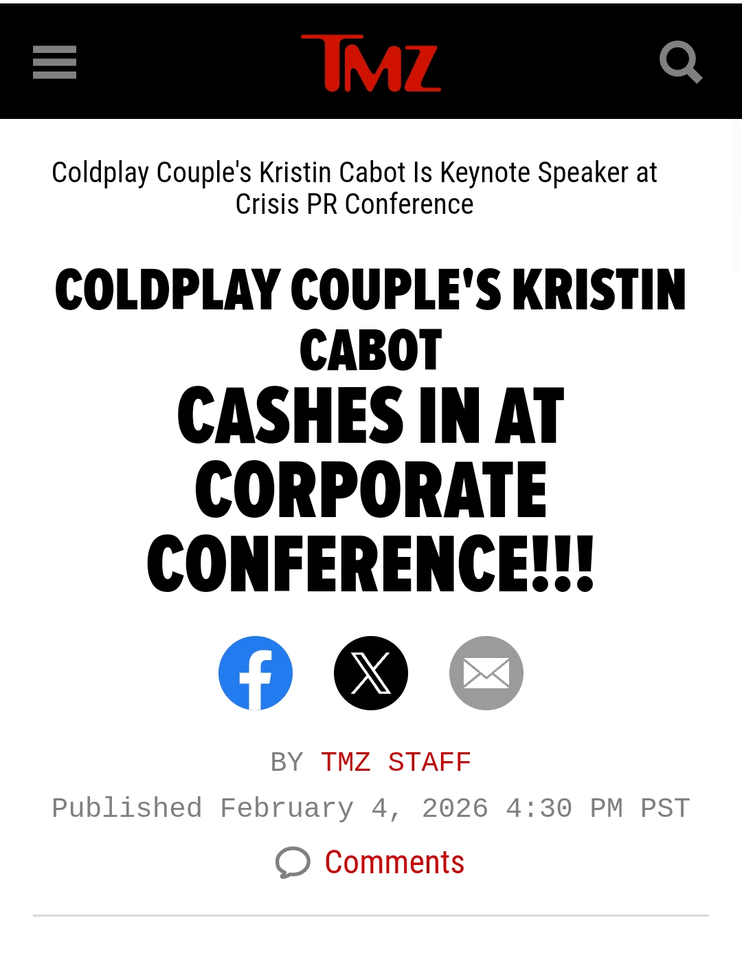 据美媒,去年酷玩乐队波士顿演唱会出轨门女方克里斯汀·卡伯特已经从这件引发全球舆论风暴的婚外情事件中找到了变现牟利方式。卡博特将于4月16日现身华盛顿特区的公关周危机沟通大会,首次以主旨演讲嘉宾的身份登台。