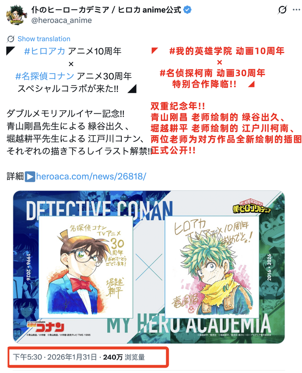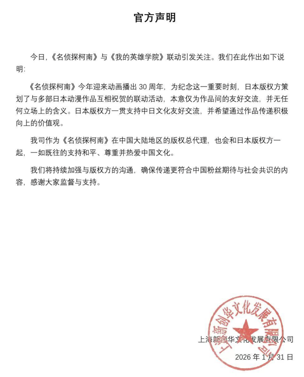 2026年是《名侦探柯南》动画播出三十周年,本来是老粉丝们的庆祝时刻,却因为版权方的“自杀式”联名决定,致使这一IP的价值面临市场危机。2020年,《我的英雄学院》因作者堀越耕平将进行人体实验的反派命名为“志贺丸太”,赤裸裸的对中华民族历史苦难发出挑衅,彻底引爆了所有中国人的怒火,该作随即被中国市场完全抵制下架,这件事中日两国的动漫业内都引发了广泛关注。令众多柯南老粉难以接受的是,此次活动不是野路子联动,而是双方作者互相绘制对方角色,以表示“相互祝贺”,这是公开的、态度明确的绑定与对对方价值的认可。尽管1月31日,《名侦探柯南》的中国大陆地区版权总代理在《官方声明》中表示:“本意仅为作品间的友好交流,并无任何立场上的含义。”但仍然很难完全平息粉丝的不满,对于此次事件,日本版权方没有公开的回应,《名侦探柯南》作者青山刚昌近日仍在为即将于4月10日公映的剧场版电影《名侦探柯南:高速公路的坠天使》做宣传,对联名的争议事件未作表态,这也令部分柯南粉丝感到失望。