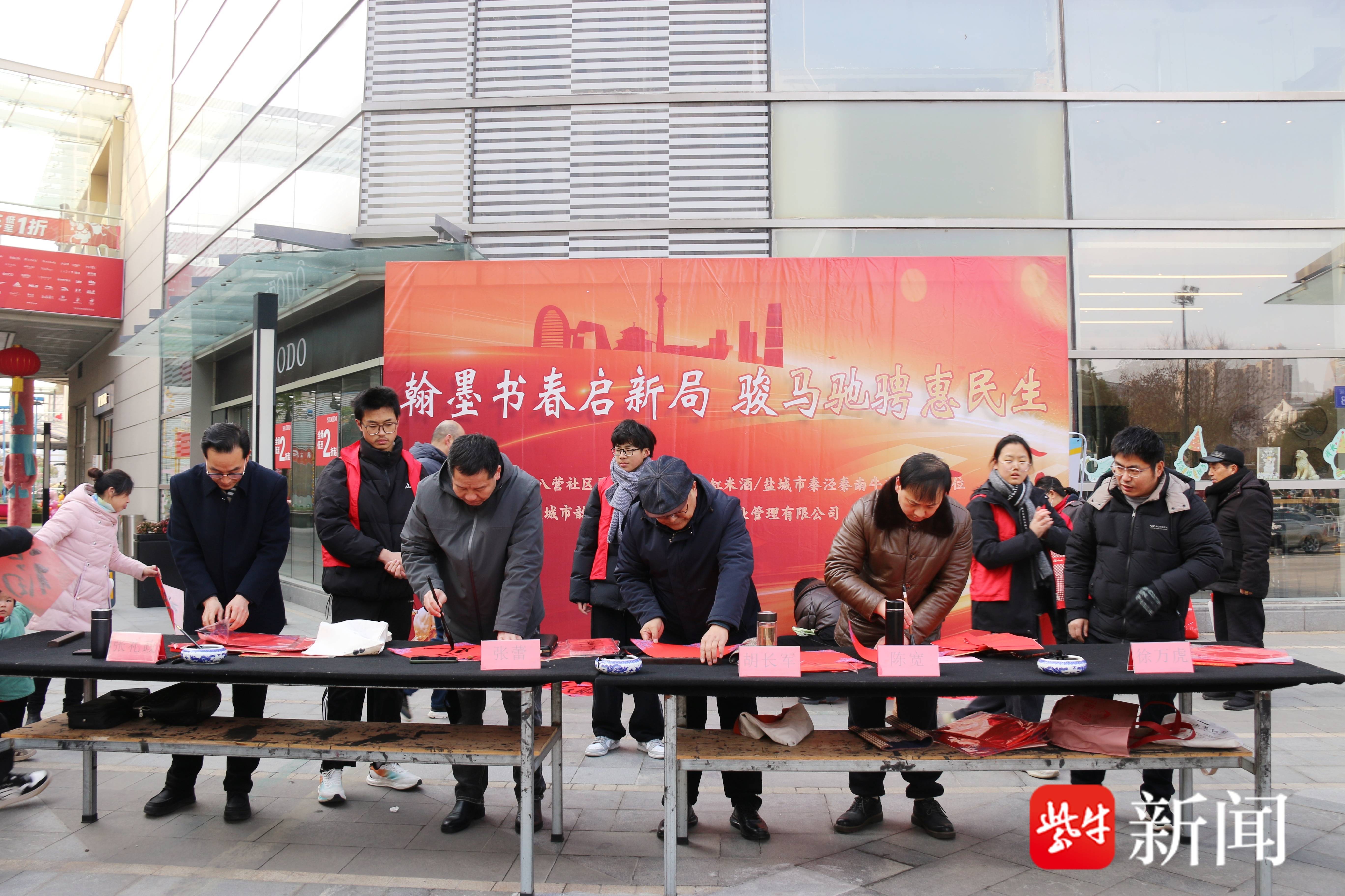 2月7日下午,由新都街道八营社区居委会、盐城市大缸米酒、盐城市秦泾秦南牛肉联合主办,盐城市韵和书院、金鹰奥莱城物业管理有限公司承办的“翰墨书香启新局 骏马驰骋惠民生”马年送福送春联活动在金鹰奥莱城隆重举行。本次活动吸引了众多居民前来参与,现场洋溢着浓厚的节日氛围与文化气息。