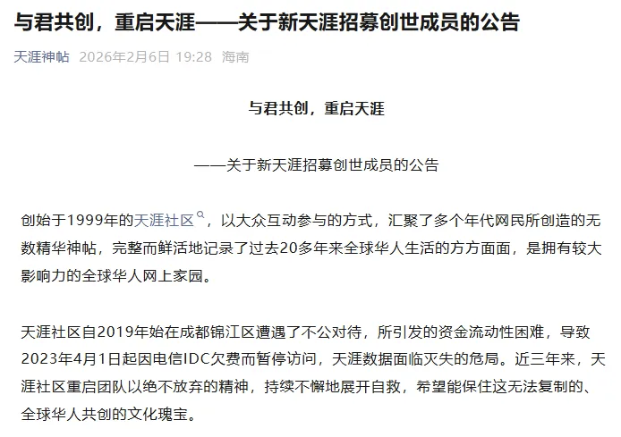因资金短缺关停近三年后,天涯社区有了新动态,2月6日晚,新天涯联合工作组、成都天涯客网络科技有限公司、天涯好东西(海南)电子商务有限公司发布联合公告,宣布重启天涯,“为确保承载着亿万网民青春记忆、原创内容和人生梦想的宝贵数据完整存续,并推进天涯社区于2026年6月1日恢复访问,天涯客公司与热心天涯重启的团队组成联合工作组,在征得天涯社区公司认可的基础上,现推出‘新天涯创世成员产品服务包’,招募9999位创世成员,成为新天涯的共建者与天涯社区重启者,共同重构全球华人的精神原乡。”