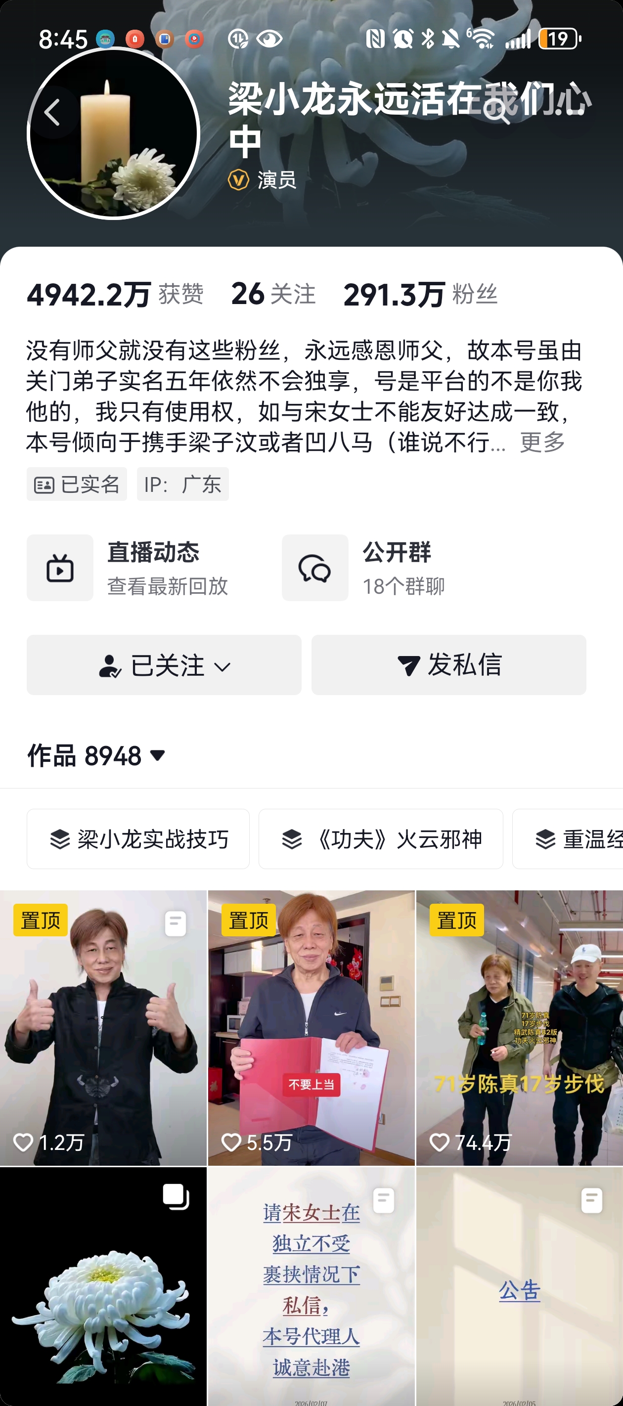 2月6日,该账号再次发布了一则由宋骧本人出镜的视频。视频中宋骧称此前声明是她本人所发,她还表示,梁小龙去世后,家人至今仍沉浸在悲痛之中,“然其相关账号在近半个月内被擅自发布75条视频,其中还包含家人庆生的私密内容,持续对我家人造成情感伤害。更甚者,该账号运营者公然扬言要删除8000余条视频,还恶意拉黑我的账号,导致我维权投诉受阻。在此,我严正要求其立即归还侵权账号,停止一切侵权行为。同时提醒广大粉丝谨防受骗,后续关于梁小龙先生的所有相关事宜,均以我及家人发布的信息为准。”
