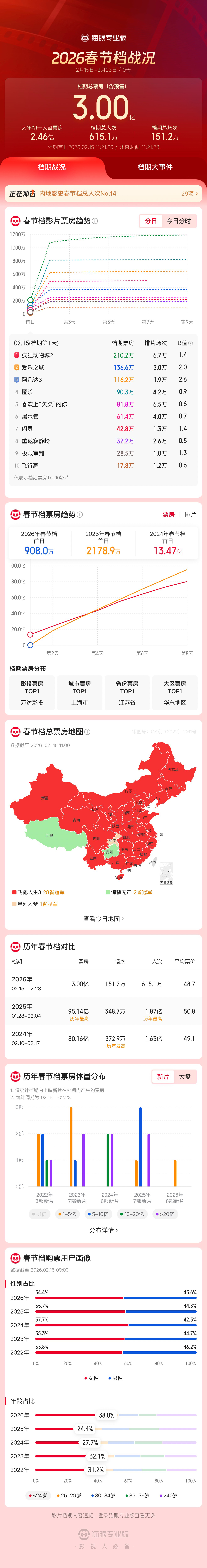 根据猫眼专业版数据,截至2月15日,2026春节档(2.15-2.23)档期预售总票房超3亿,档期内预售票房前三名的影片分别为《飞驰人生3》《惊蛰无声》《镖人:风起大漠》,其中《飞驰人生3》单片预售票房破亿,暂时领跑今年春节档。剩下三部影片《星河入梦》《熊出没·年年有熊》和《熊猫计划之部落奇遇记》暂时位列春节档第四到六名,预售票房也都在一千万以上。