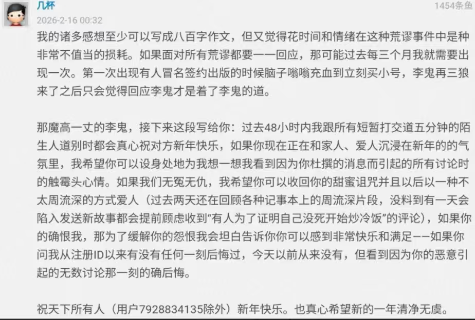 16日凌晨,“几杯”在青花鱼论坛发文辟谣去世消息,“我的诸多感想至少可以写成八百字作文,但又觉得花时间和情绪在这种荒谬事件中是种非常不值当的损耗。”几杯也向发布讣告的网友喊话:“如果你现在正在和家人、爱人沉浸在新年的的气氛里,我希望你可以设身处地为我想一想我看到因为你杜撰的消息而引起的所有讨论时的触霉头心情。” 青花鱼论坛是原创文学网站长佩文学的旧站,随着长佩文学网站的发展,官方已推出了新网站,旧站服务器老旧,访问并不稳定,几杯曾在该网站连载小说。