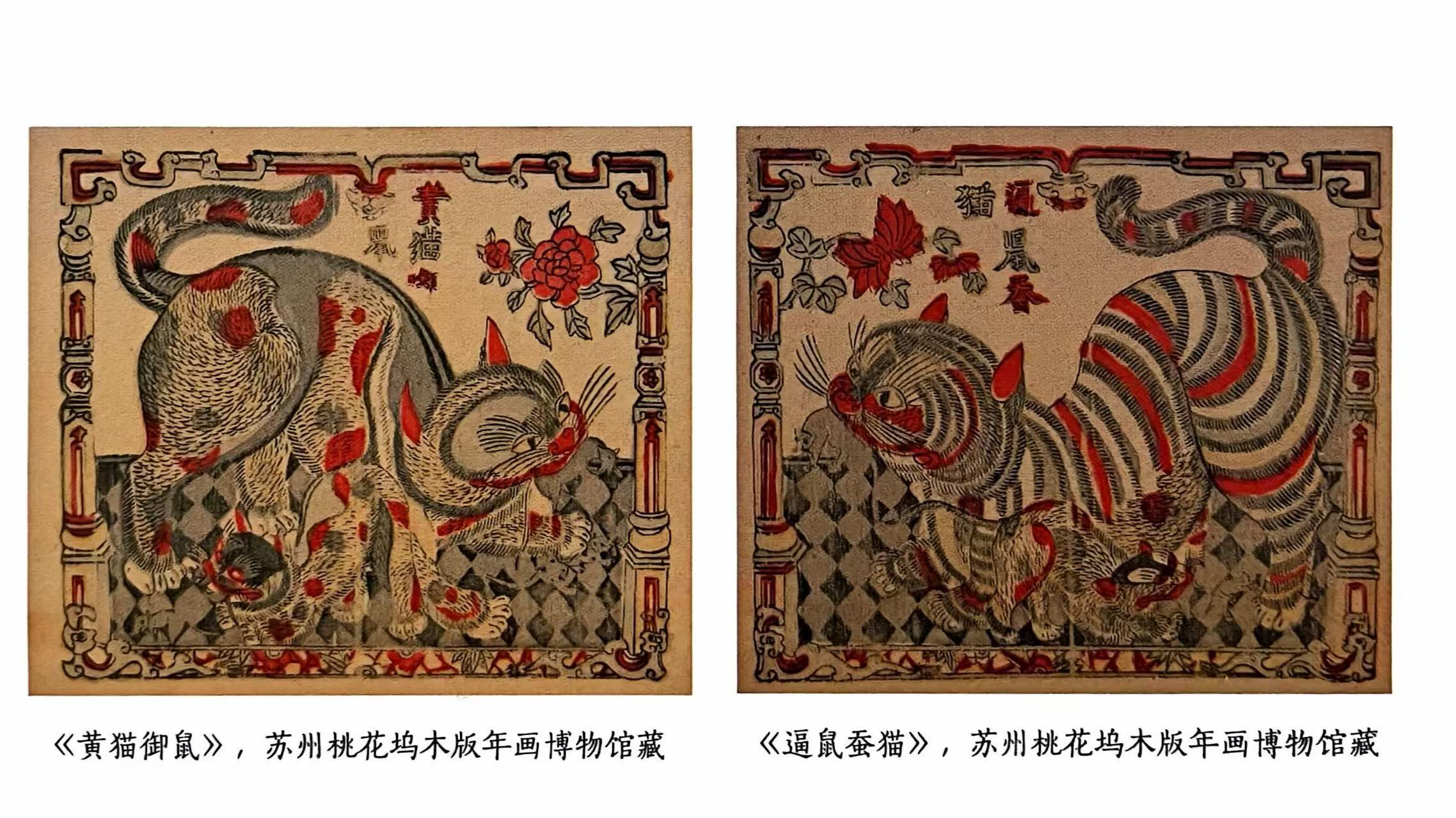 我们最关注的可能是吉庆类,主要是在节日、婚嫁期间使用,比如春节、元宵节、端午节、中秋节、重阳节等等;还有一类是和现实紧密相关,比方说江南一带丝绸业发达,几乎家家养蚕,那么养蚕的房门上就会贴“猫”的年画《避鼠馋猫》《黄猫御鼠》,防老鼠或虫子。同时还会贴姜太公,“姜太公在此百无禁忌”,防止有一些不好的疫情感染到蚕宝宝。