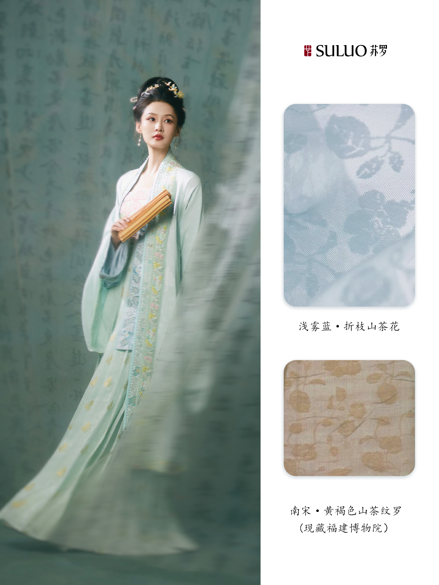 此次李沁化身桂花神李清照,身穿非遗花罗亮相总台春晚,衣上桂花隐隐,暗送清雅。其汉服衣身纹样取自宋代:牡丹桂花纹(四经绞罗):褙子及裙身纹样来自周塘桥南宋纪年墓出土黑色缠枝牡丹纹罗交领袍,现藏常州博物馆,牡丹与桂花相映,寓意富贵美好;折枝山茶(三经绞罗):短衫纹样来自南宋黄晟墓出土的黄褐色山茶纹罗,现藏福建博物院,山茶傲霜,寓意坚韧高洁。罗衣清透飘逸,桂花纹若隐若现,恰似“移从月中来”的诗意朦胧。今夜此衣,不仅载着宋代纹样之美,更寄予一份东方祝福——愿您如衣上桂花,清雅自在,岁岁安康。