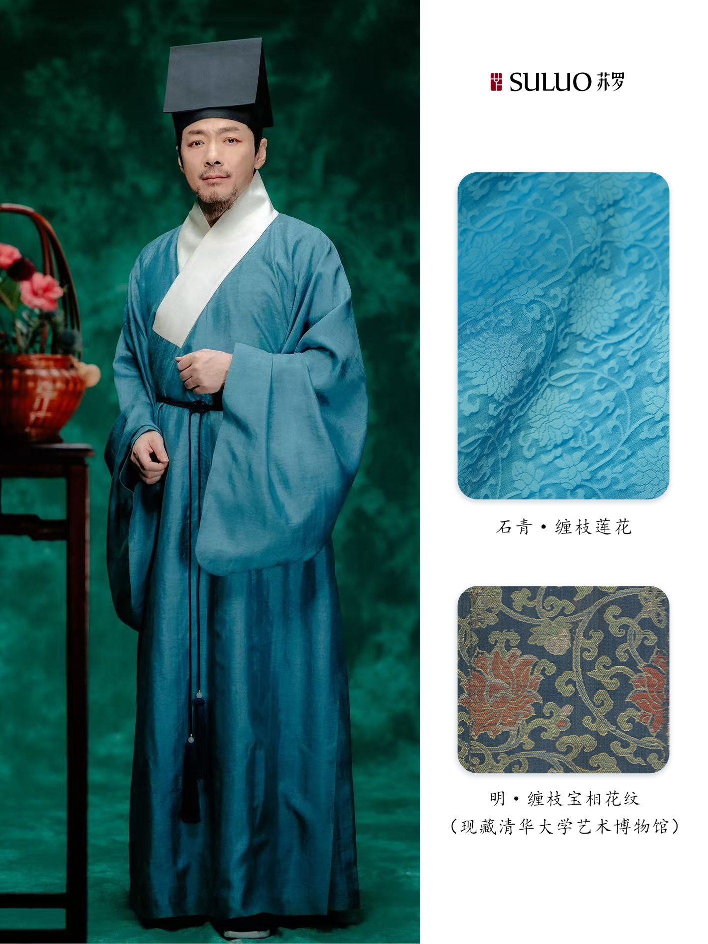 祖峰饰演蜀葵花神徐渭,一袭明制道袍,似“立如芝兰玉树,笑若朗月入怀”,风仪清举,温润端方。其衣身纹样皆取自明代,石青缠枝莲花纹(二经绞罗),衣身复刻明代缠枝宝相花纹,现藏于清华大学艺术博物馆),莲枝连绵,象征团圆和美。米色折枝梅纹(二经绞罗):护领部纹样源自明代孔府旧藏花鸟裙,现藏山东博物馆,梅开五瓣,梅影清绝,寓君子坚韧风骨。梅莲相映,既重现明代士人的雅致,也在当代续写传统美学中刚柔并济、清正端方的风度。