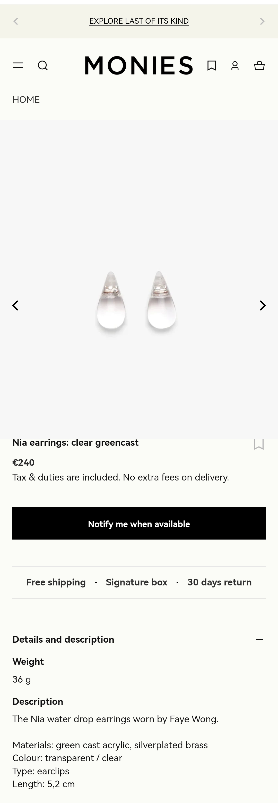 这款水滴耳环和去年王菲带火的“虾片耳环”都来自丹麦小众珠宝品牌Monies,该品牌是1973年由丹麦金匠夫妇Gerda Lynggaard和Nikolai Monies在哥本哈根创立的珠宝品牌,以斯堪的纳维亚自然美学风情和先锋设计语言著称。这款水滴耳环官网售价位240欧元,折合人民币近2000元,官网介绍材质为亚克力材质和镀银黄铜。