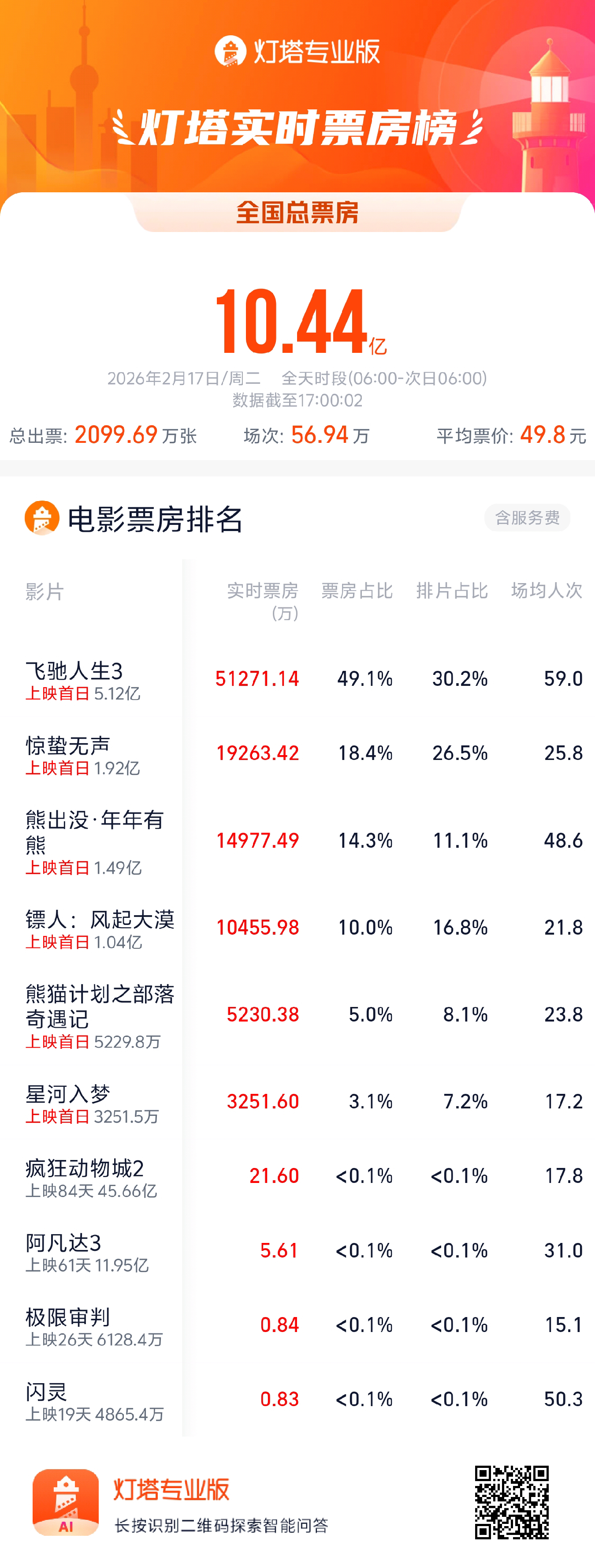 根据大麦娱乐旗下灯塔专业版数据显示,截至2月17日17时,2026年大年初一(2月17日)大盘票房已突破10.44亿,春节档(2月15日-2月23日)档期总票房(含预售)突破12.67亿。
