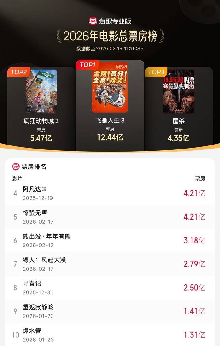 据猫眼专业版数据,截至2月19日11时14分,2026年年度总票房(含预售)突破50亿!《飞驰人生3》《疯狂动物城2》《匿杀》暂列年度票房榜前三位。