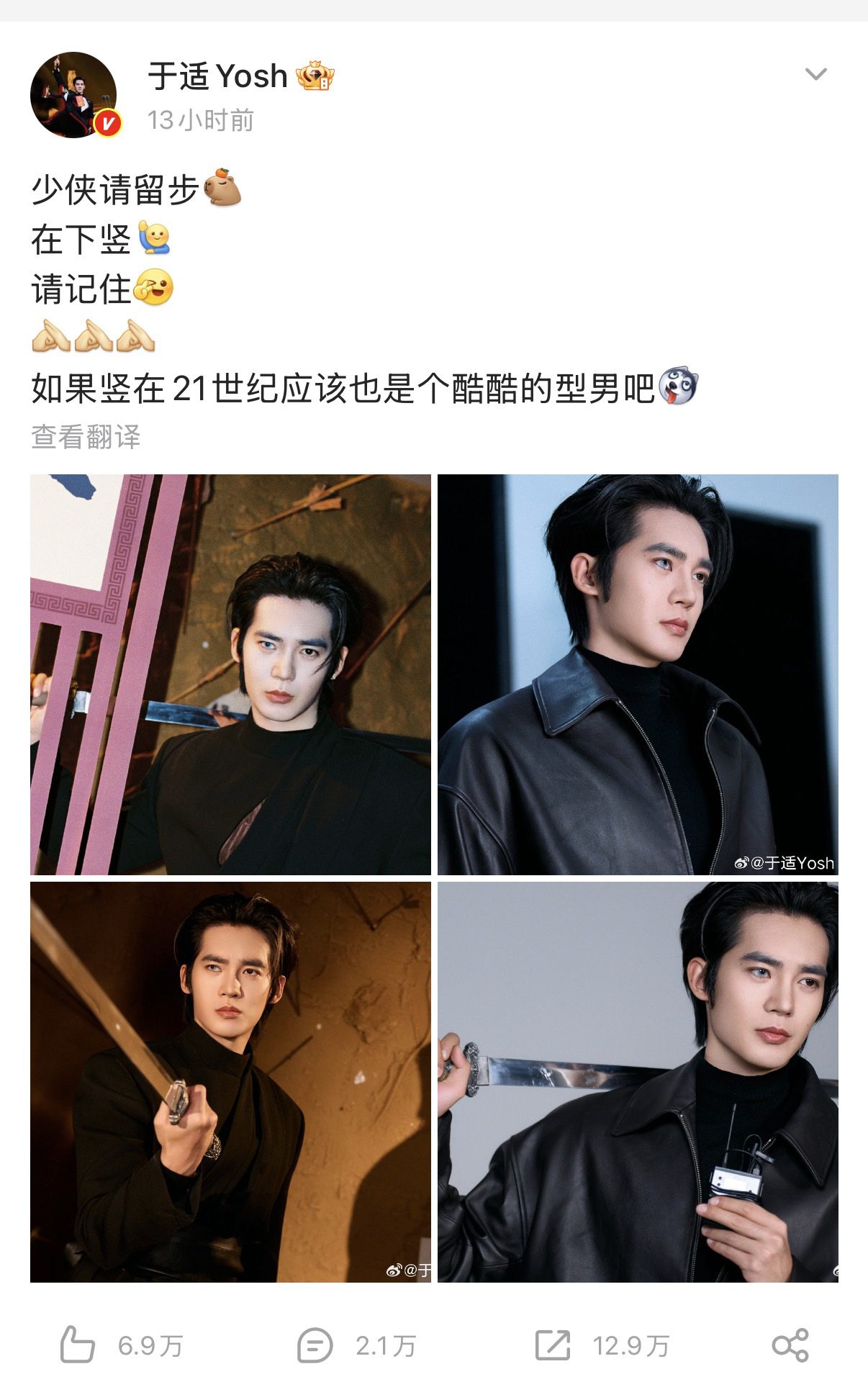 18日晚,于适发文称:如果竖在21世纪应该也是个酷酷的型男吧。有网友在评论区则调侃地发出了竖一身黑色火油的“黑照”。