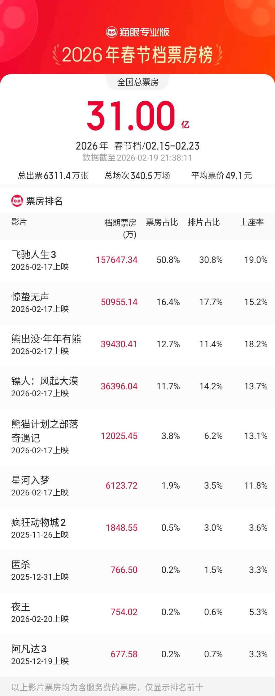 根据猫眼专业版数据,截至2月19日晚22点整,2026年春节档(2.15-2.23)总票房超31亿。其中,2月17日大年初一的单日票房达12.78亿,单日总场次数达59.5万场,刷新中国影史大年初一单日场次数纪录。同时,在春节档的带动下,2026年全年票房也于今日顺利超过50亿大关,目前达到了56.24亿。