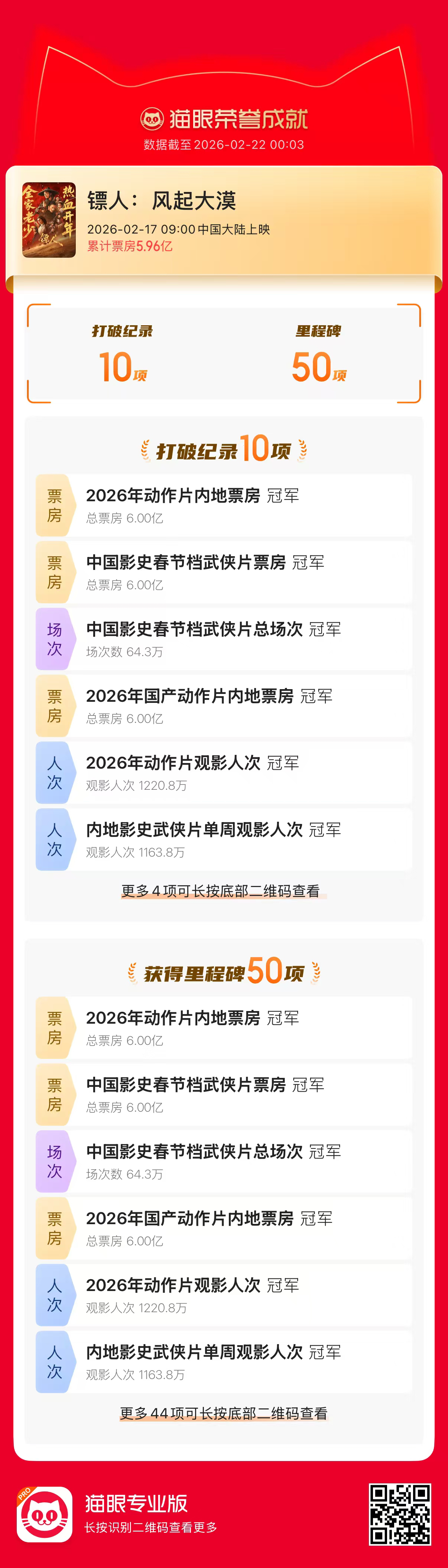 据猫眼专业版,截至2月22日,电影《镖人》上映6天,已打破10项纪录,并以破6亿的成绩,成为中国影史春节档武侠片票房榜第一名。记者看到,紧随其后的是2025年徐克导演的《射雕英雄传:侠之大者》,2017年舒淇等主演的《健忘村》,以及2011年徐克导演,李连杰、陈坤、周迅等主演的《龙门飞甲》。